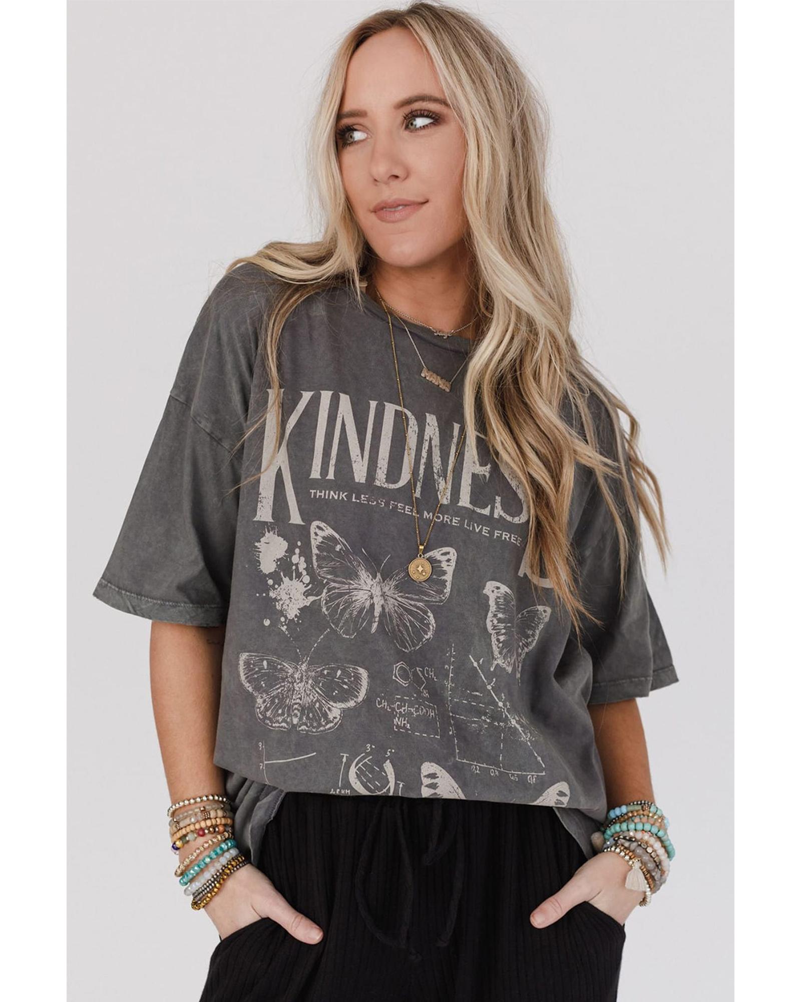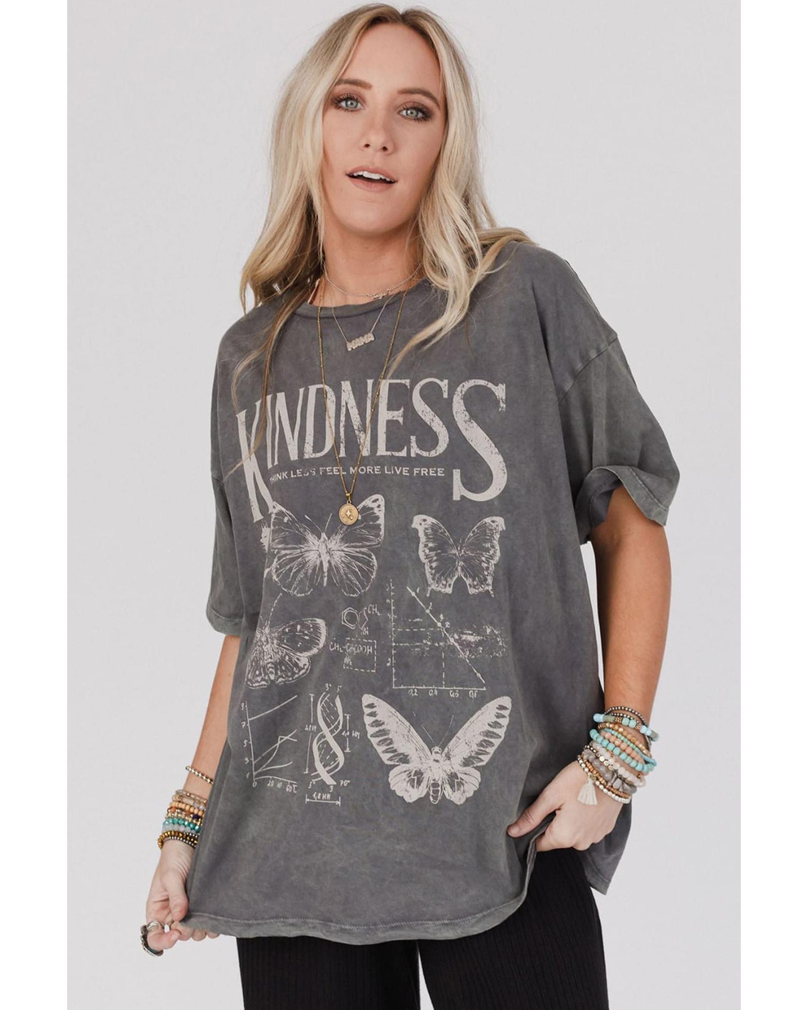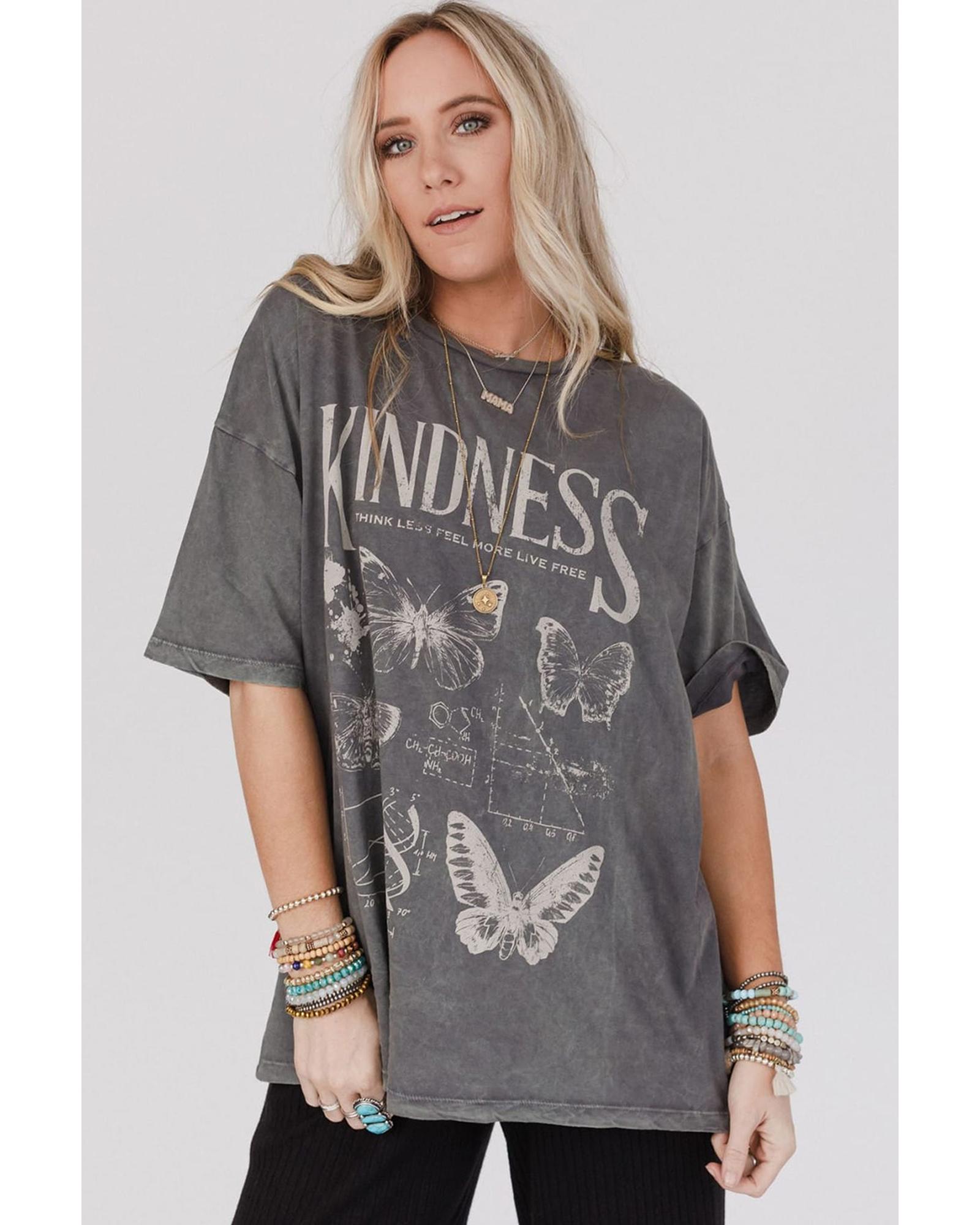 Dark Grey Kindness Butterflies Graphic Mineral Wash Loose Tee – L