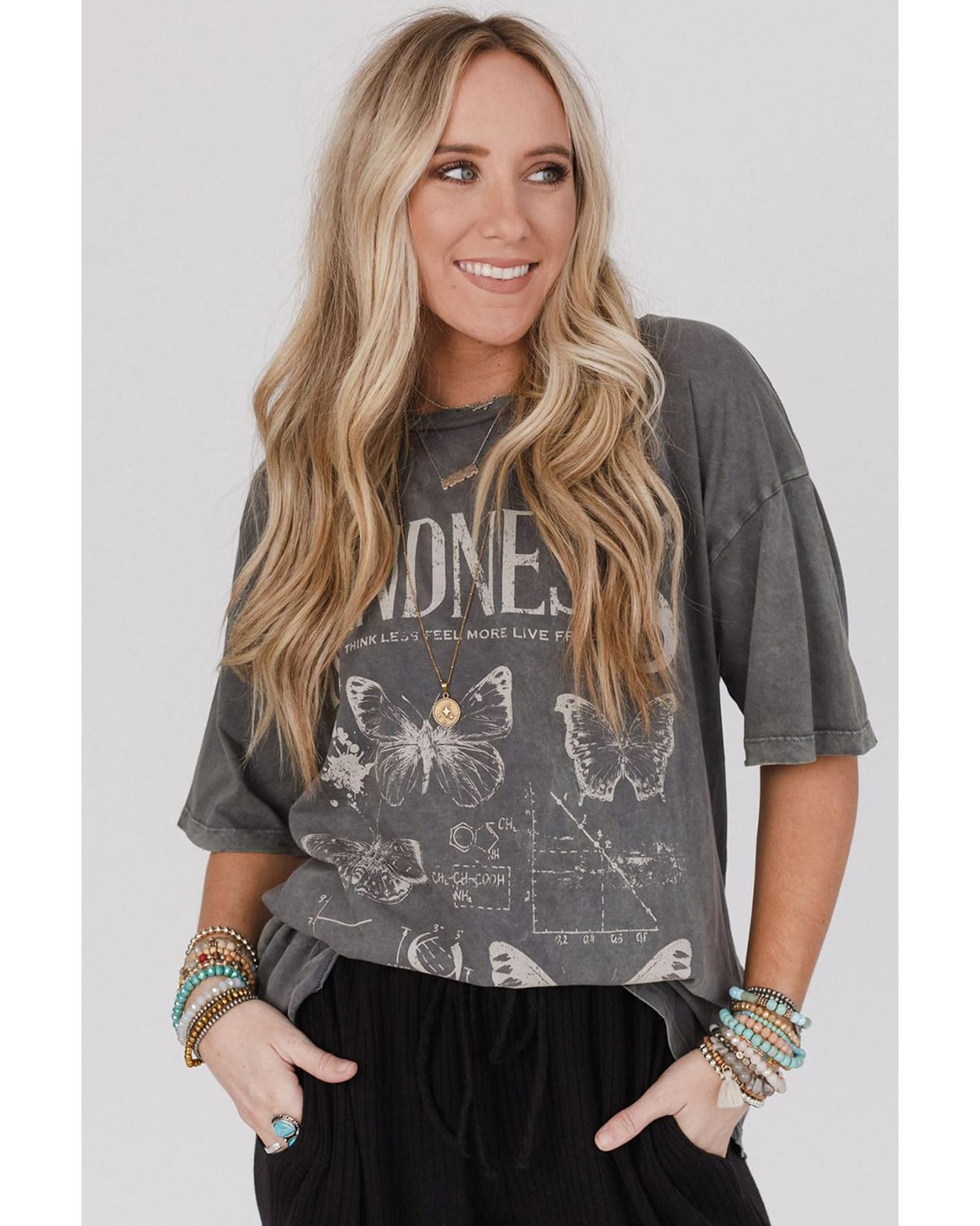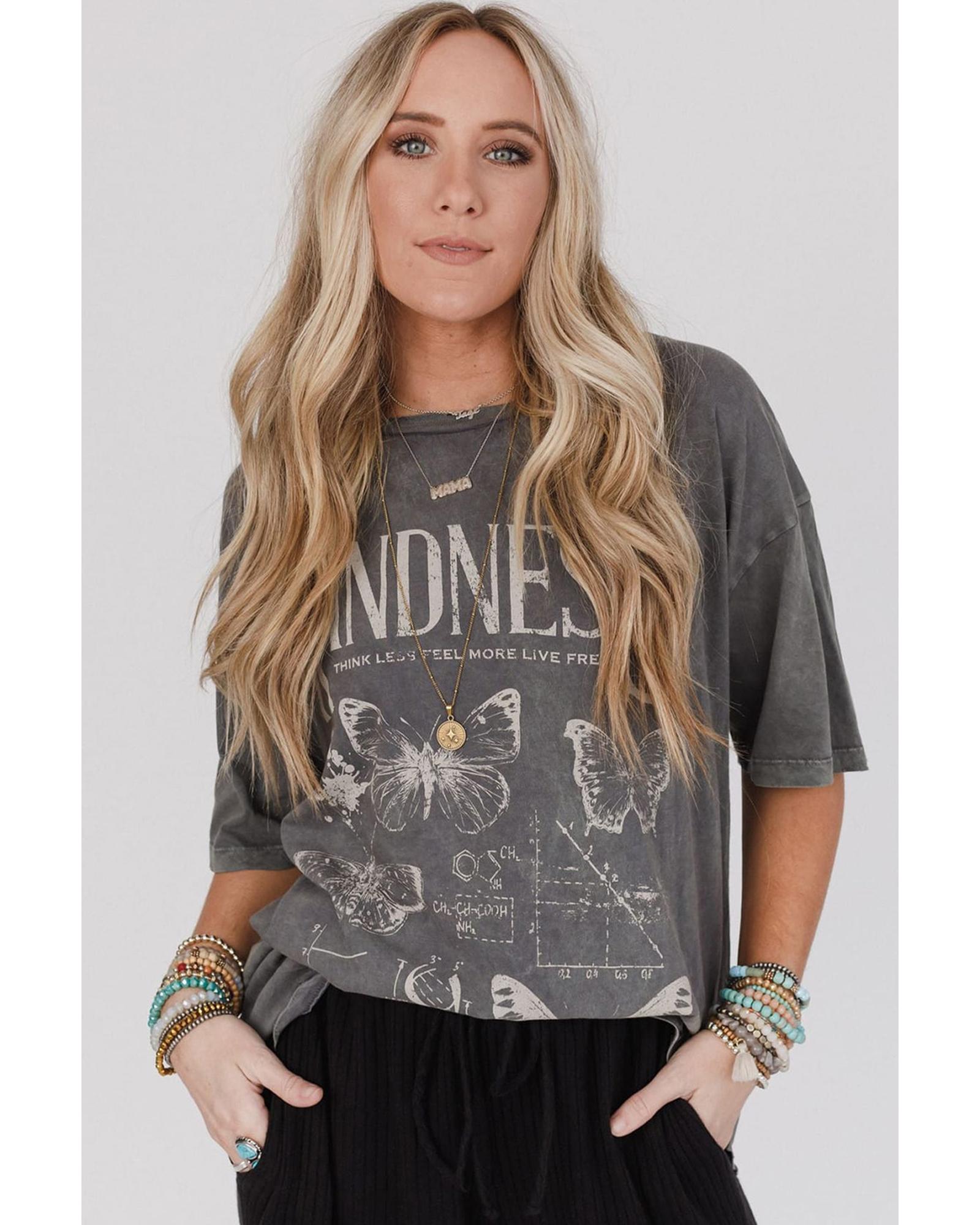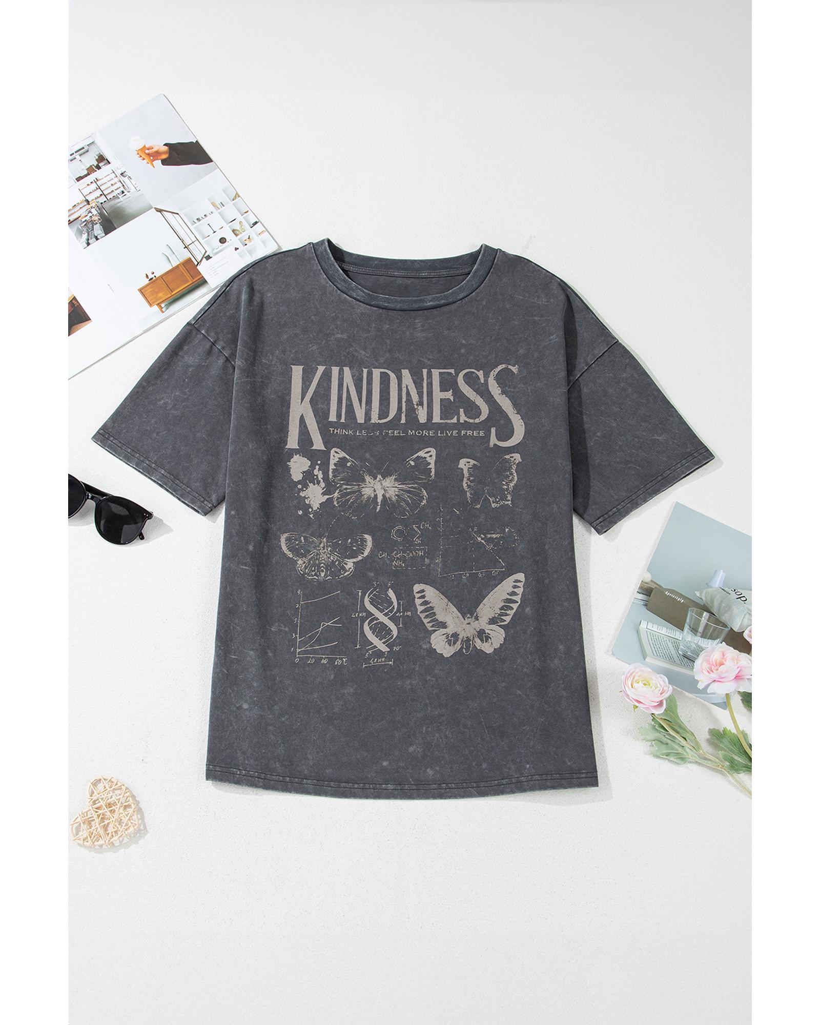 Dark Grey Kindness Butterflies Graphic Mineral Wash Loose Tee – L