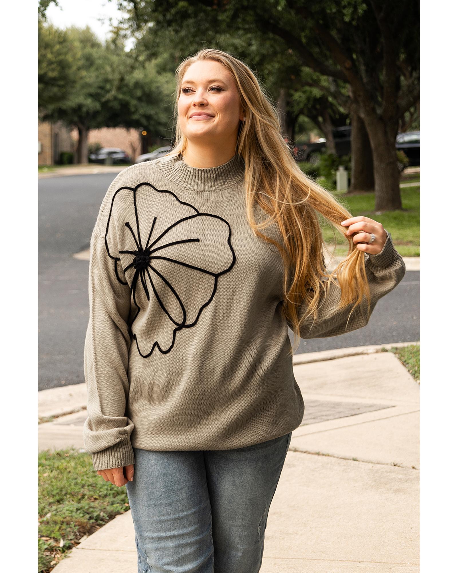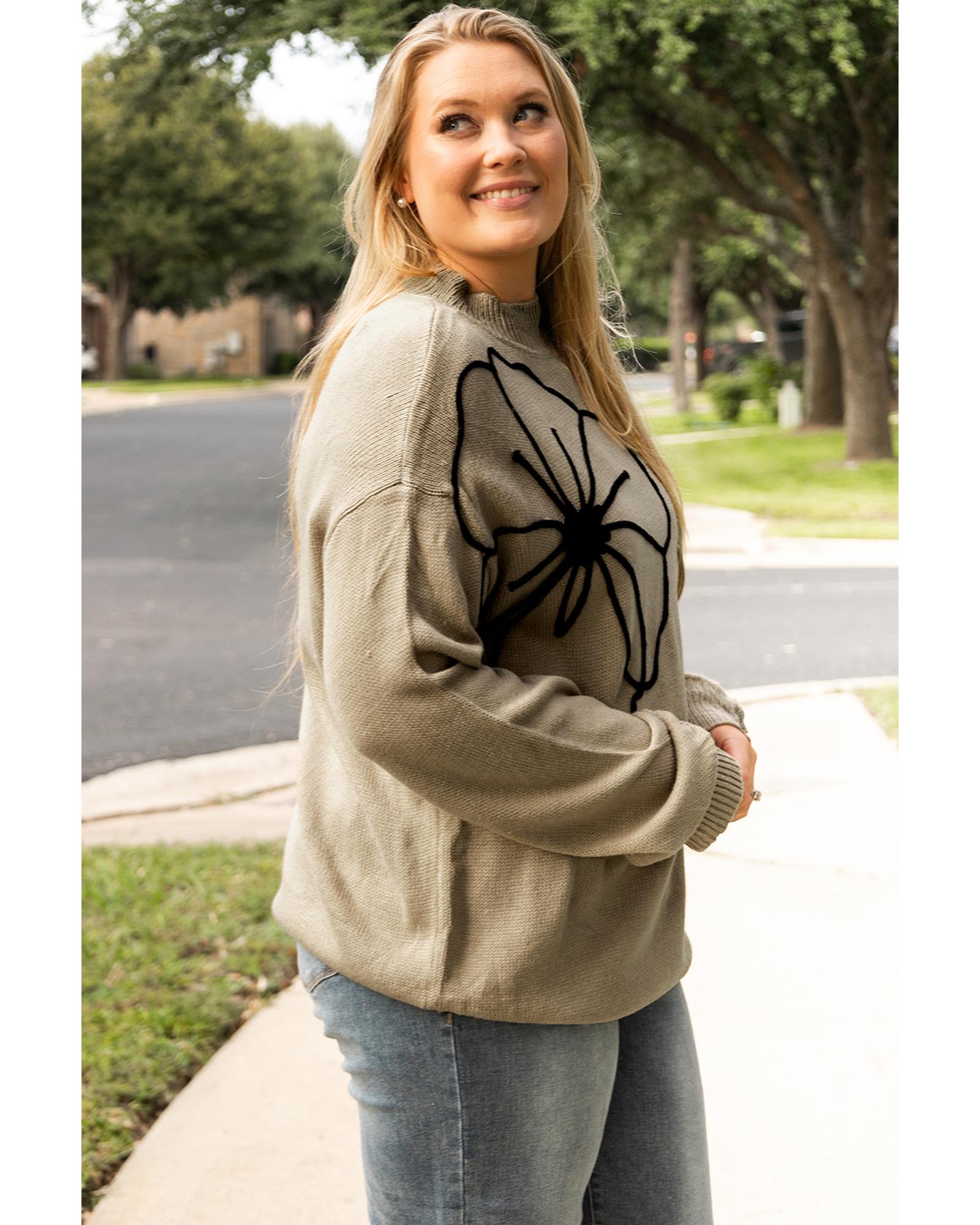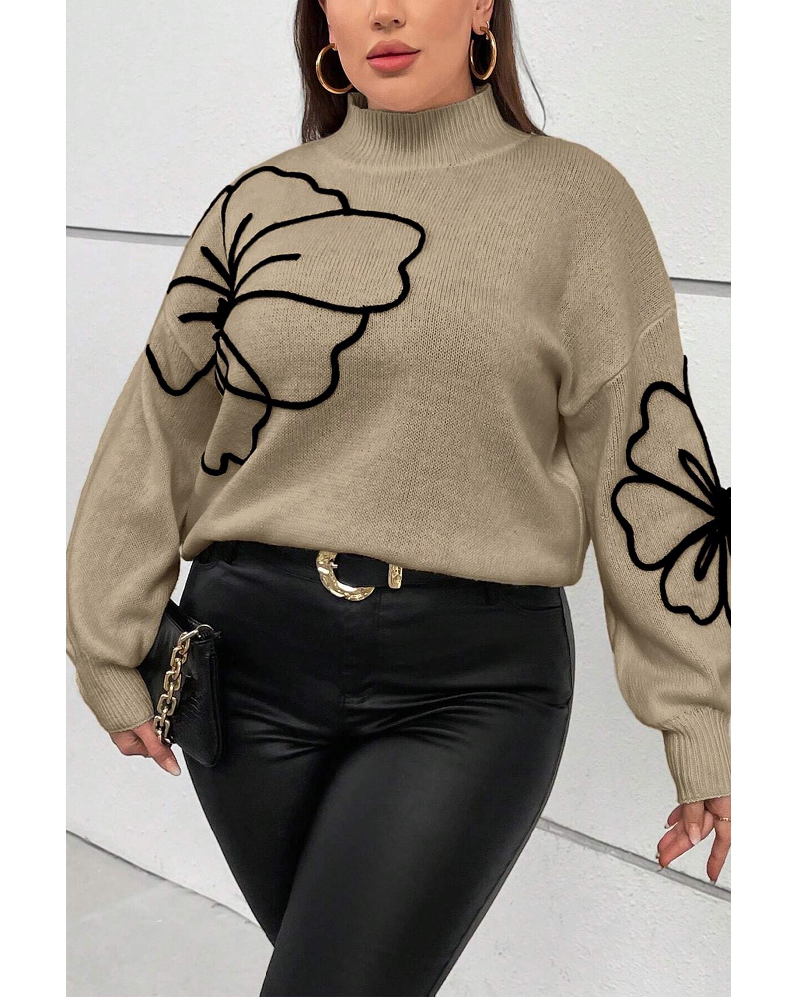 Dark Khaki Plus Size Big Flower Pattern High Neck Drop Shoulder Sweater – 2X
