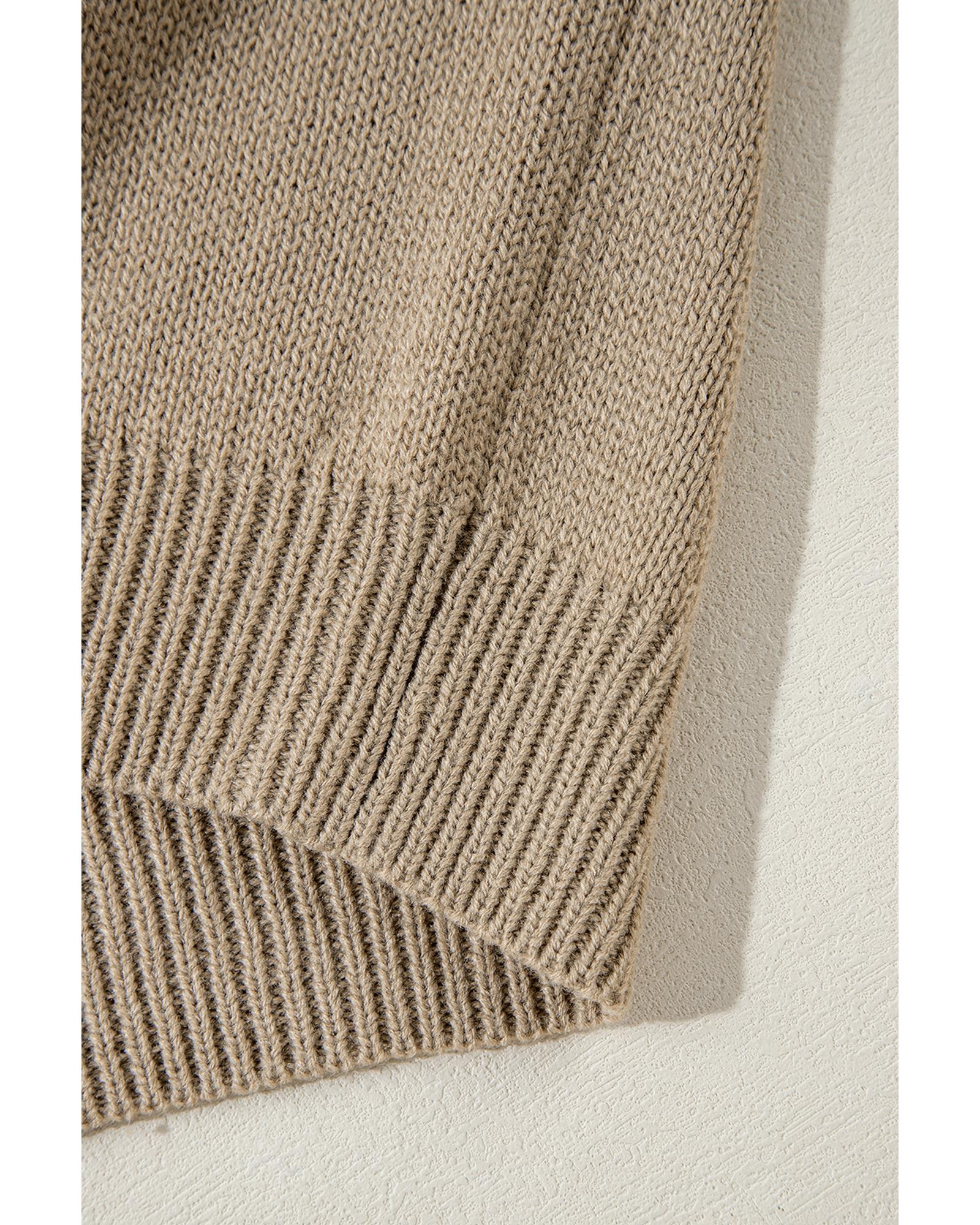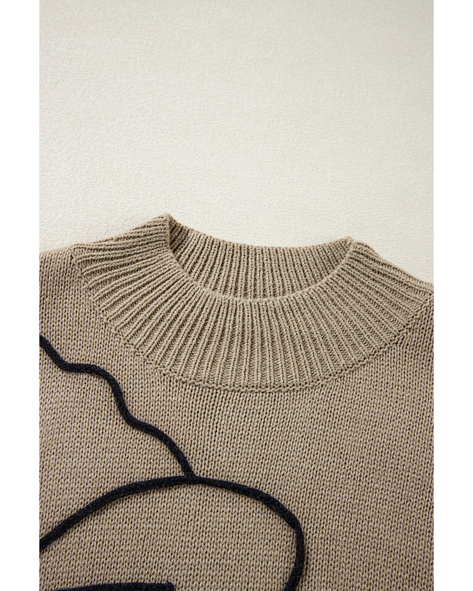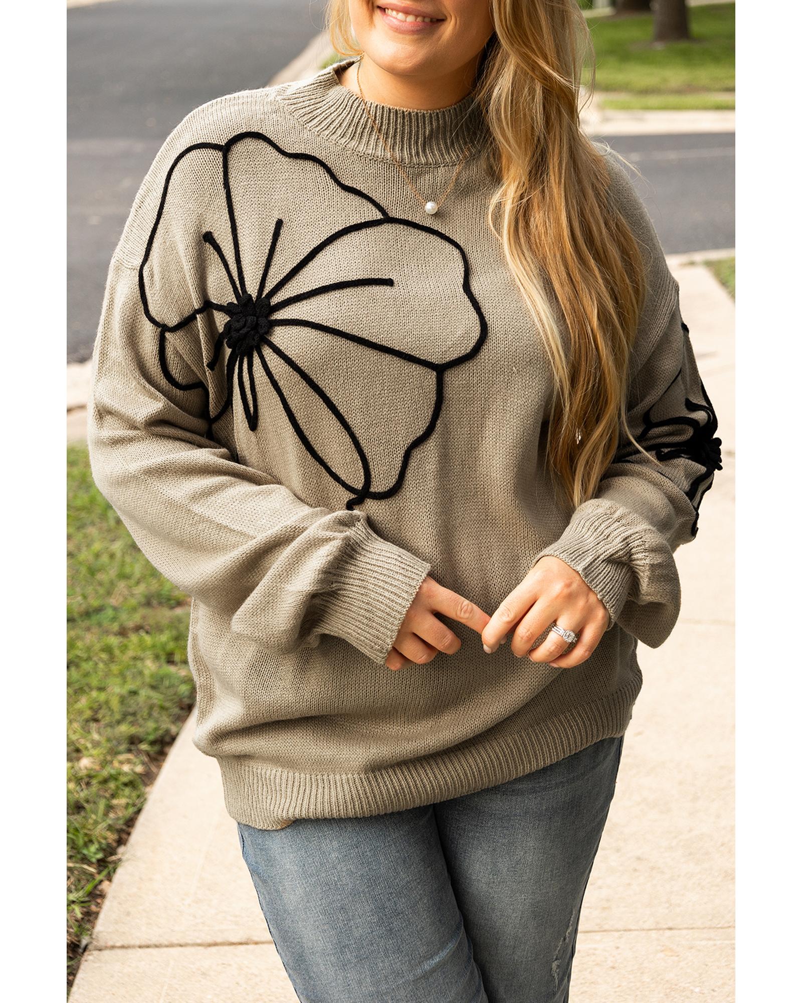 Dark Khaki Plus Size Big Flower Pattern High Neck Drop Shoulder Sweater – 2X