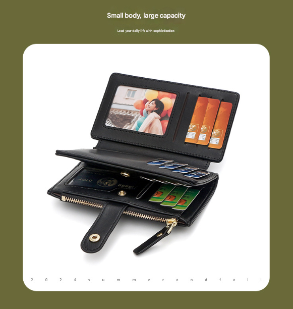 - Structure: Multiple Card Slots, ID Window, Banknote Compartment, Zippered Coin Pocket