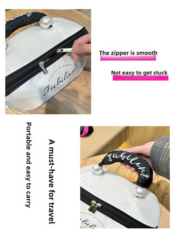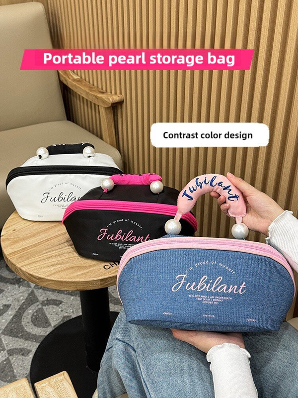 Denim Blue Portable Waterproof Color Block Makeup Bag with Pearl Handle, Large Capacity Cosmetic Storage Organizer for Travel and Daily Use