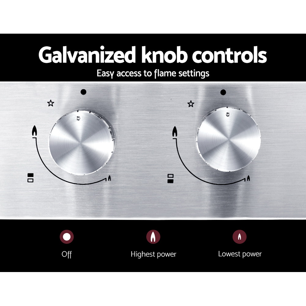 Whether it is for your existing or new home, our Devanti 30cm Gas Cooktop is just the right thing you need for easy, no-fuss cooking. Loaded with an extensive list of chef-friendly features such as an easy ignition system, easy-to-use galvanized knob controls with a safety lock and flame failure safety device, the cooktop is also incredibly sleek with its stainless steel surface. It features two burners, a wok burner and one auxiliary burner, with various power levels to choose from to prepare that perfect dish. The solid cast iron grates hold up your pots and pans perfectly steady and are longlasting and heat-resistant as well. And a pan support is included for use with the auxiliary burner to prevent tiny pans from tipping over and messing up your cooktop. The cooktop is factory set for natural gas but is compatible with LPG once the included LPG conversion kit is installed. Powerful and yet integrally safe, the cooktop promises many moments of hassle-free delicious cooking with the right blend of sophistication and class for your kitchen.