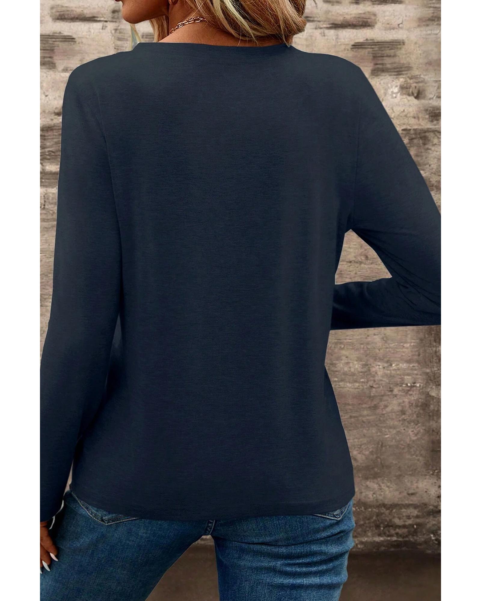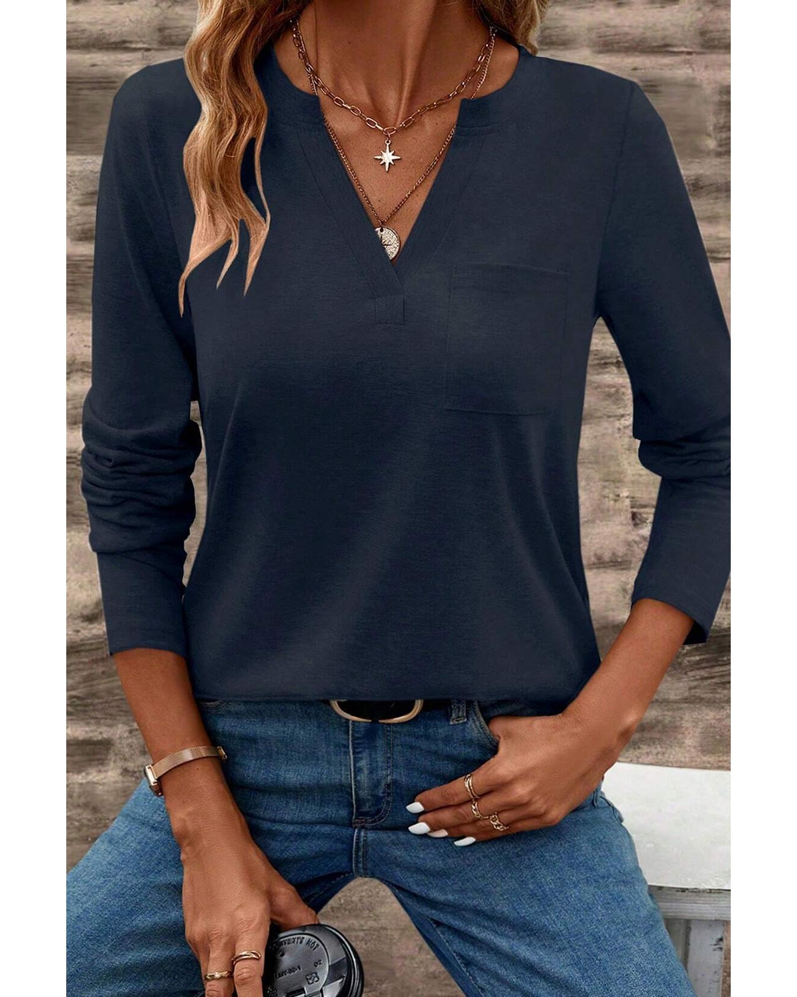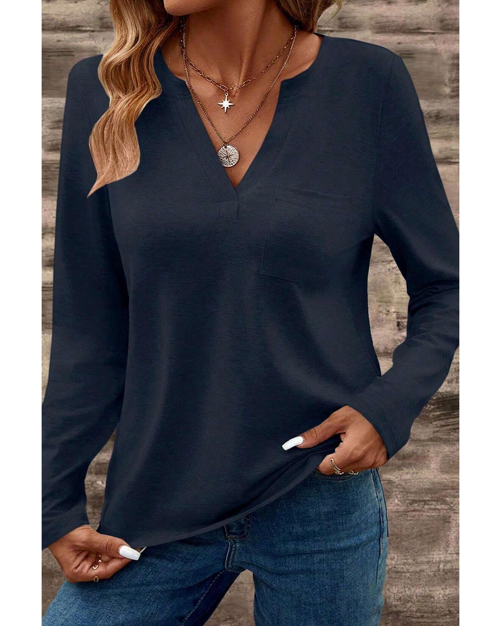 Dirty blue Notch V Neck Pocket Patched Long Sleeve T Shirt – M