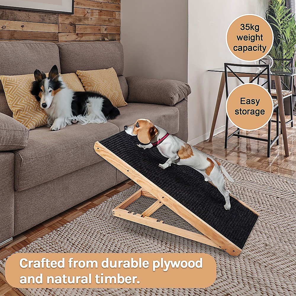 Crafted from durable plywood and natural timber, this free-standing ramp is perfectly sized for small to medium dogs or other small animals. A non-slip carpet surface makes it easy for your dogs to navigate the climb.