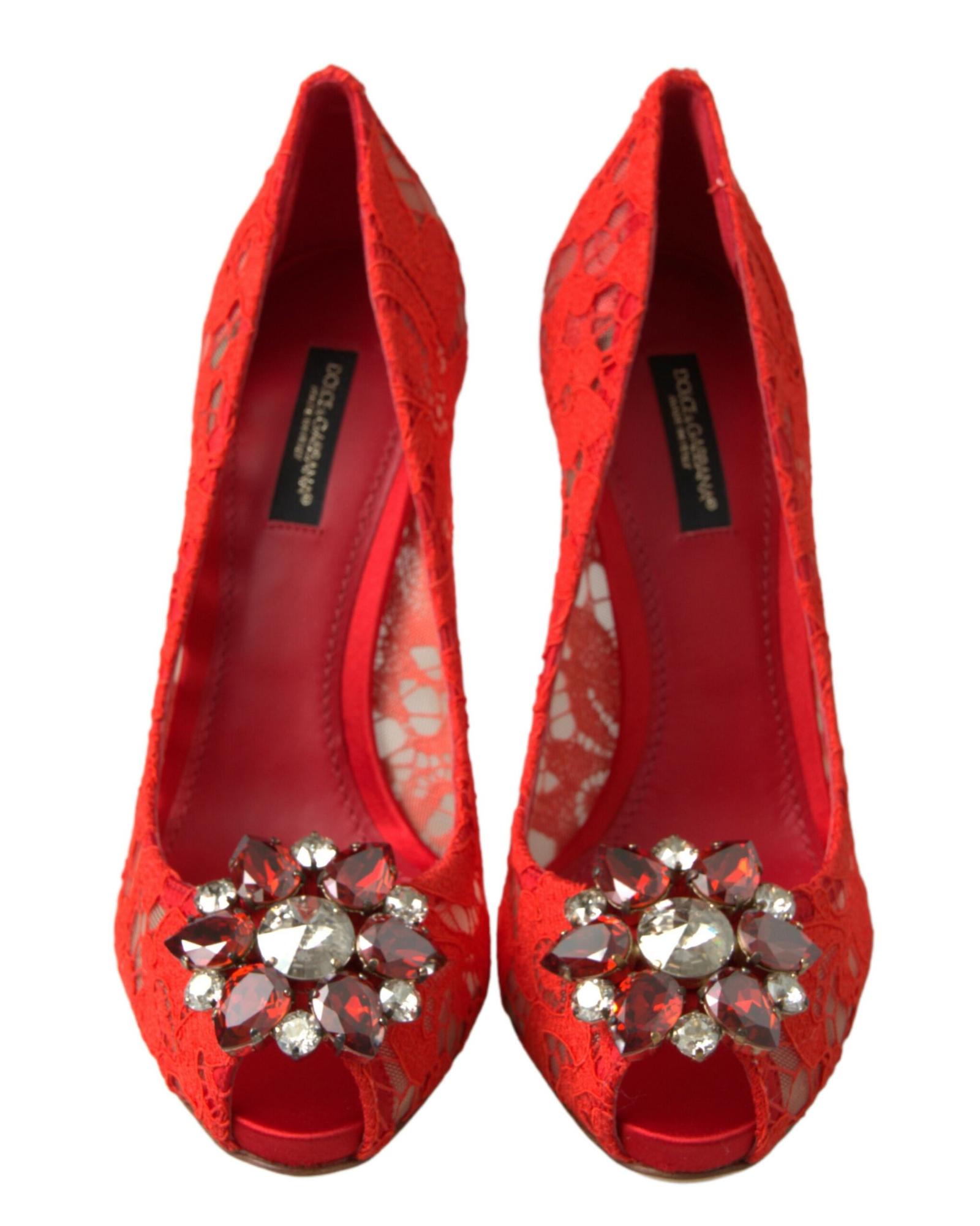 Dolce & Gabbana Women's Red Taormina Lace Crystal Heels Pumps Shoes - 38 EU