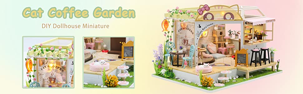 Dollhouse Miniature with Furniture Kit Plus Dust Proof and Music Movement – Cat Coffee (Valentine’s Day Gift Idea)