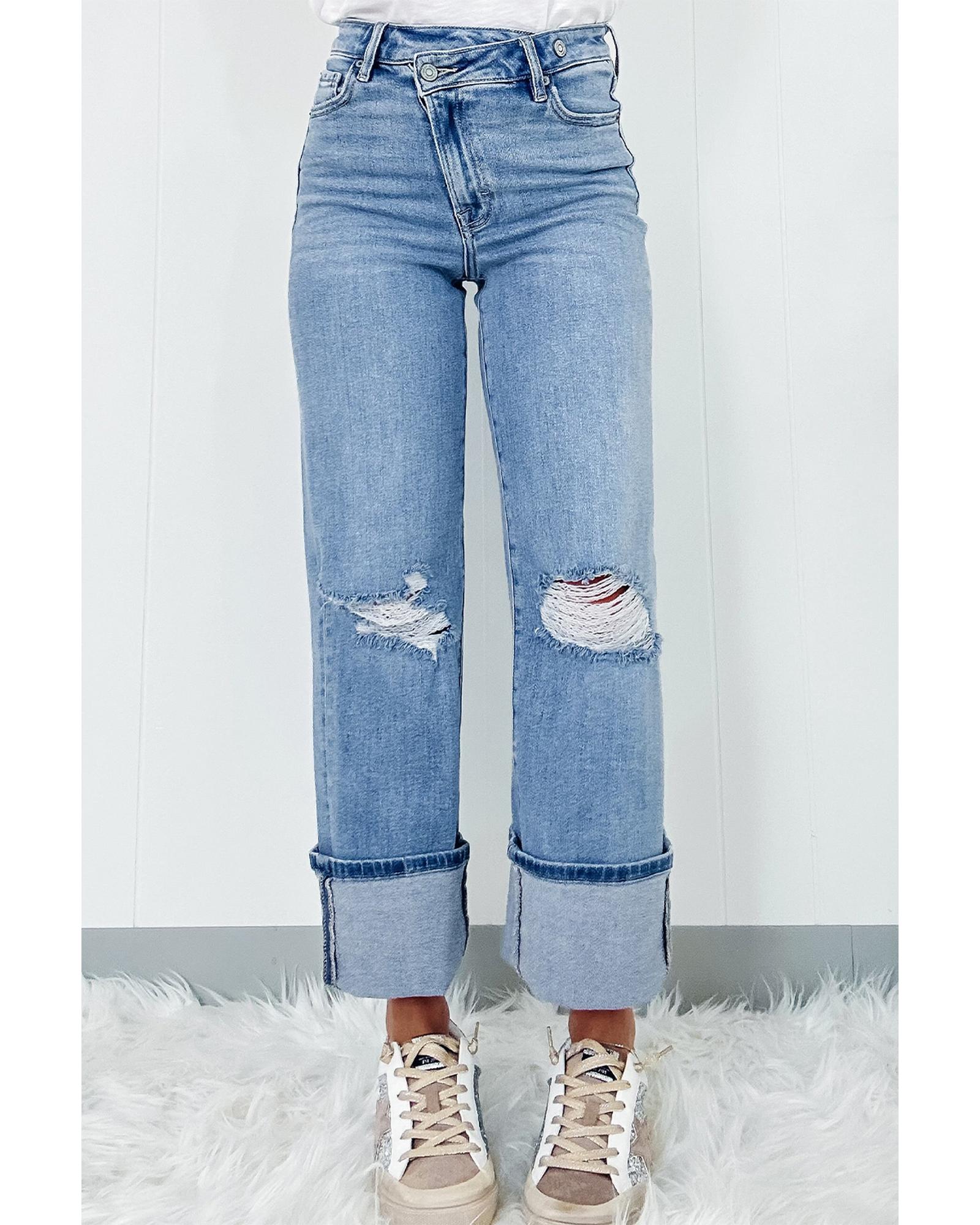 Dusk Blue High Rise Asymmetric Button Zip Fly Ripped Jeans - 16 US