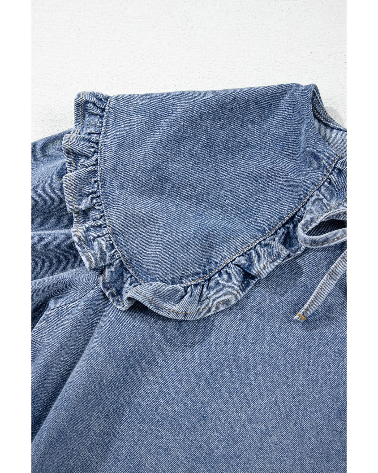 Dusk Blue Ruffled Collared Side Pockets Puff Sleeve Denim Mini Dress - S