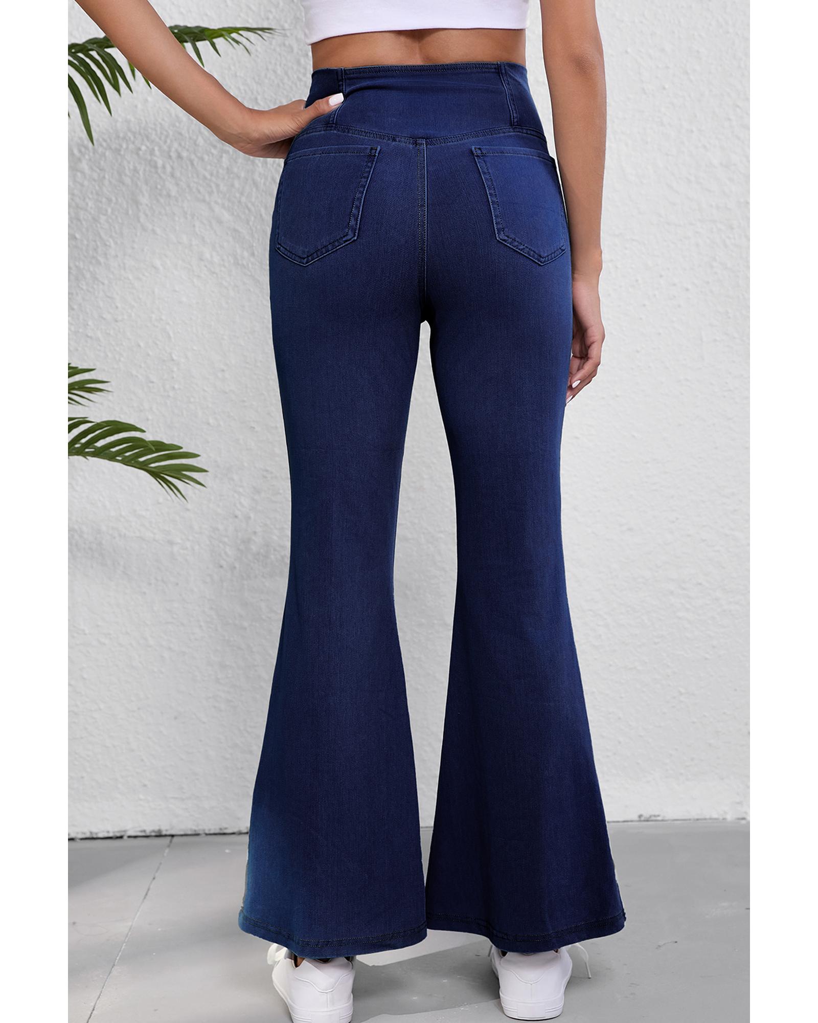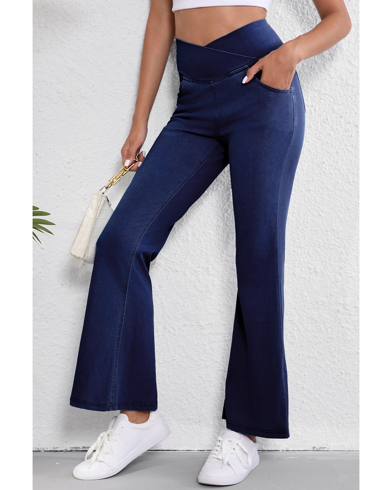 Dusk Blue Solid Crossed Waist High Elastic Fit Flare Knit Jeans – M