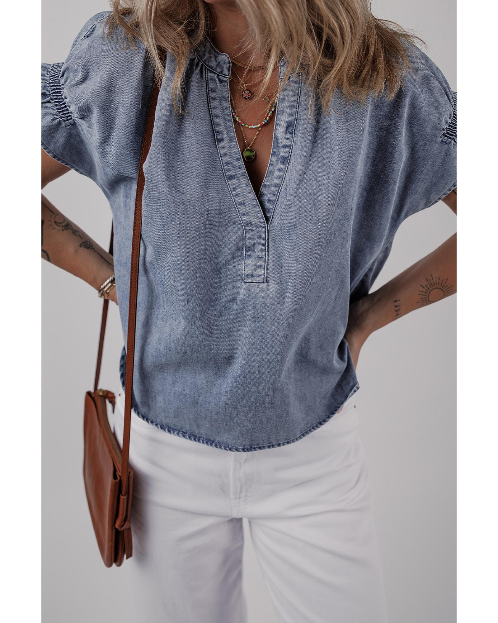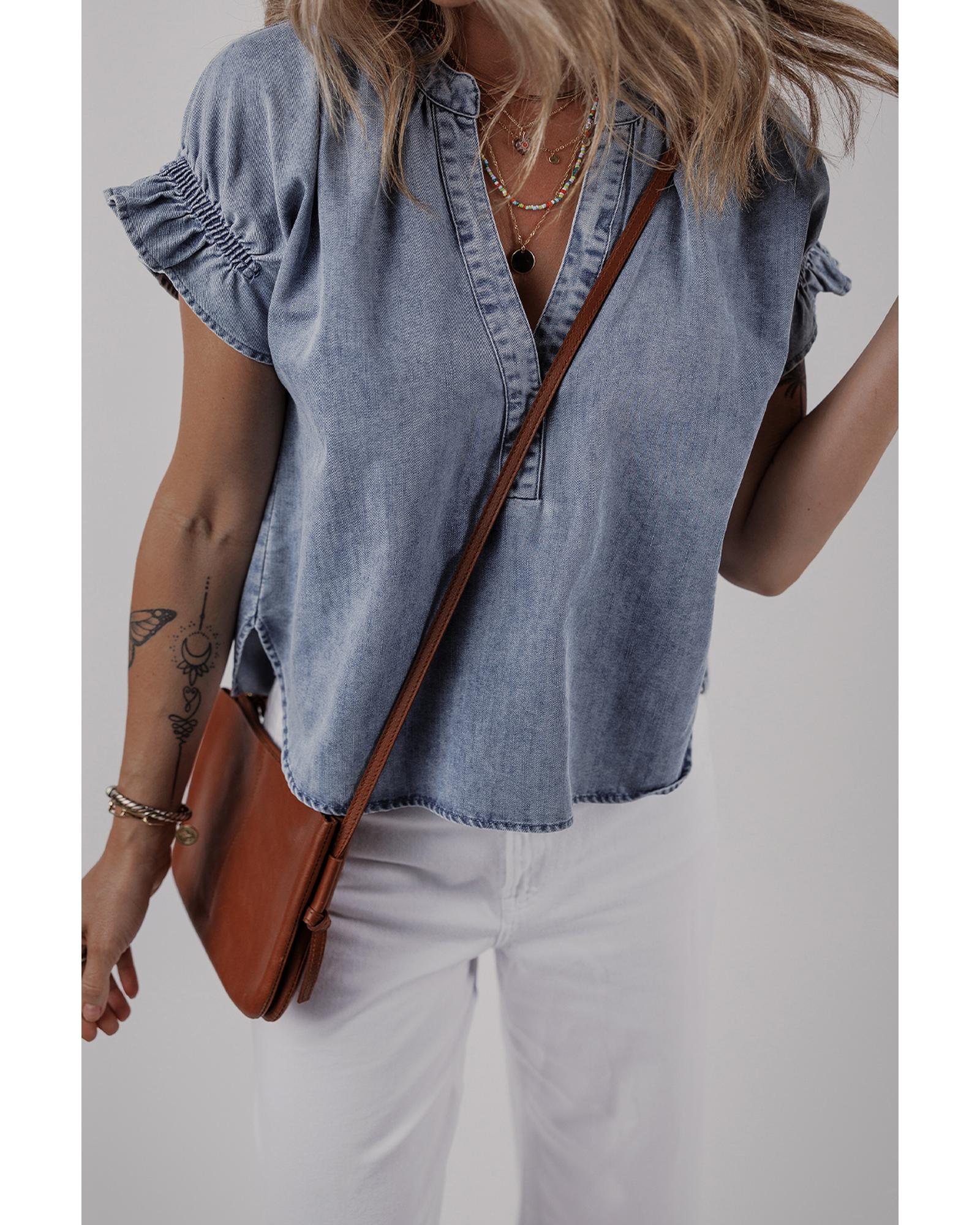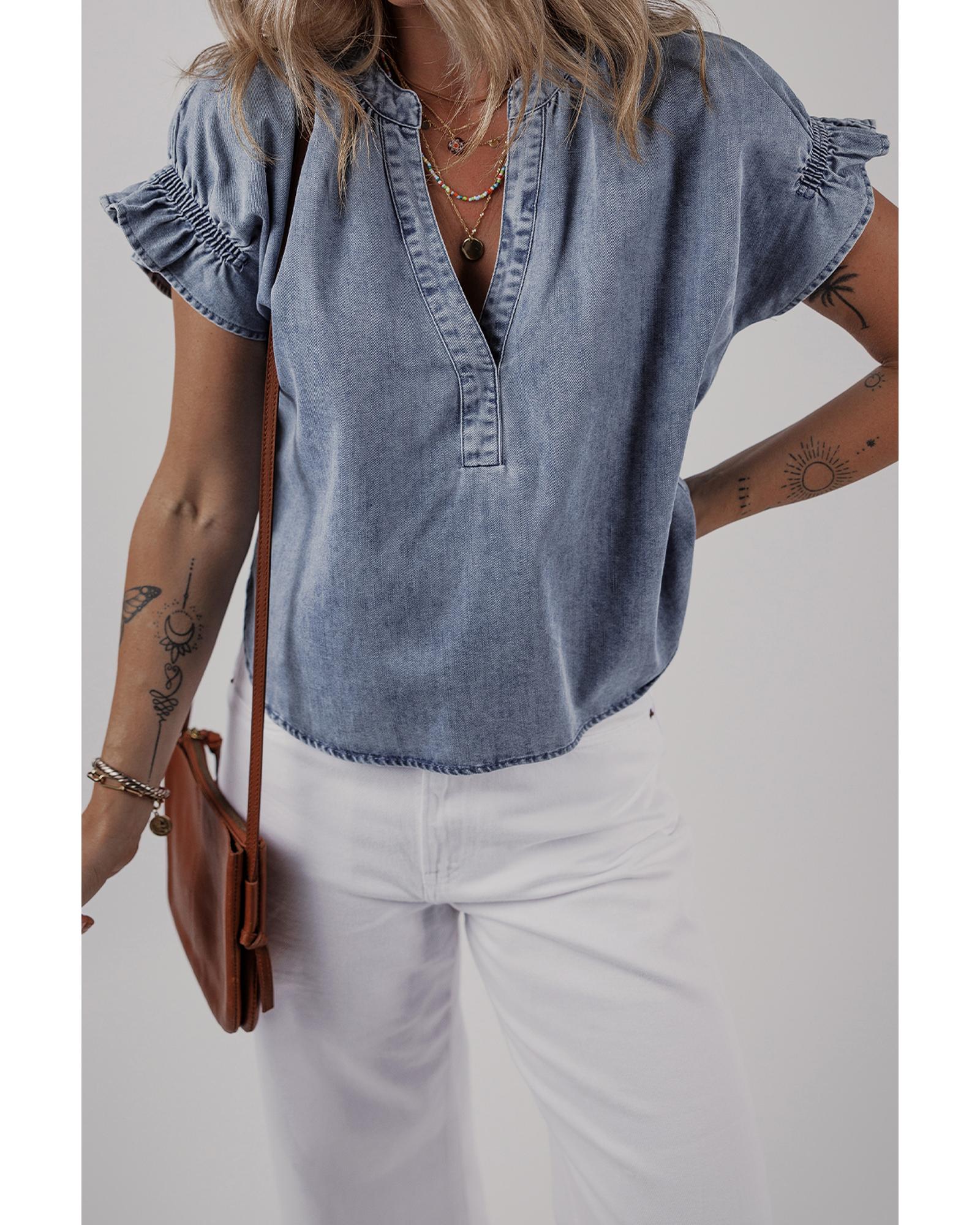 Dusk Blue V Neck Ruffled Short Puff Sleeve Denim Top – L