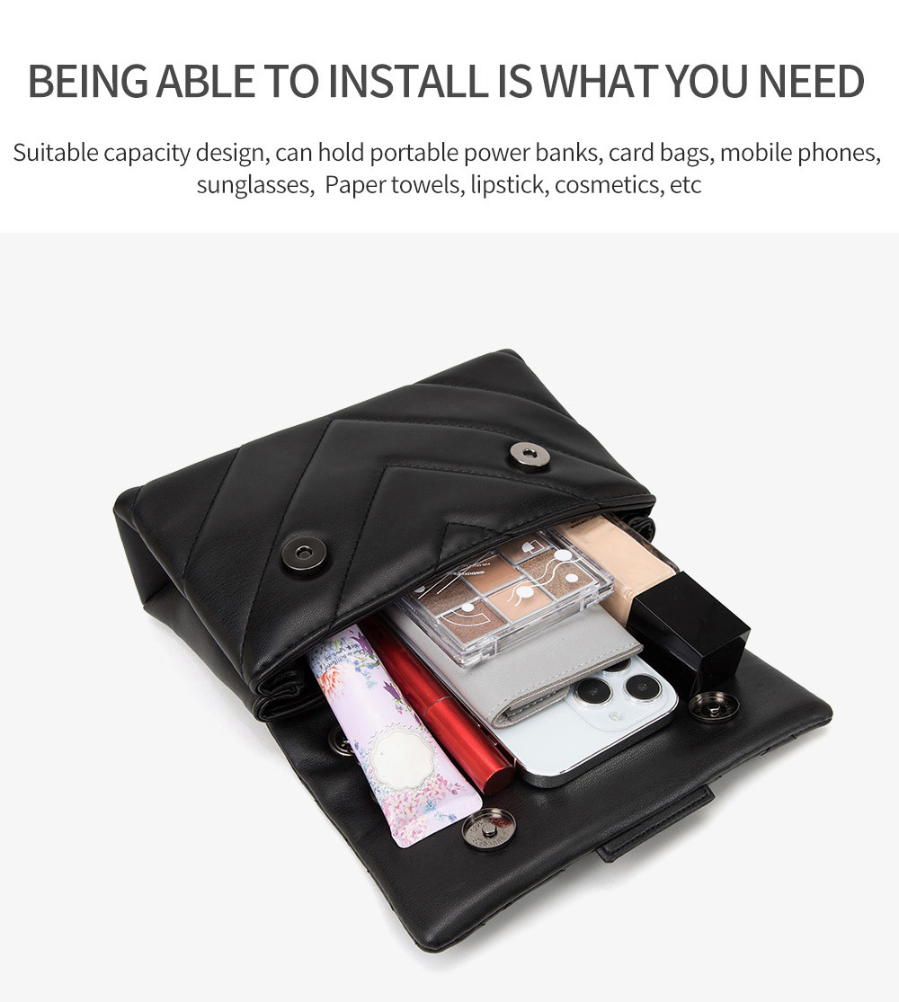 Embrace a trendy and sophisticated style with this Elegant Quilted PU Leather Chain Bag. This “little bread” style bag has seen a continuous rise in popularity, offering a retro and elegant charm perfect for any occasion. Crafted from carefully selected, delicate high-quality PU leather, it provides a comfortable touch and soft texture. The bag is adorned with a distinctive, textured bird head hardware decoration, adding a unique and fashionable charm. Meticulously crafted in every detail, it features a convenient magnetic buckle closure and durable chain hardware perforations. The suitable capacity design can hold essentials like portable power banks, card bags, mobile phones, sunglasses, paper towels, lipstick, and cosmetics, with an internal pocket sticker and main bag compartment for organization.