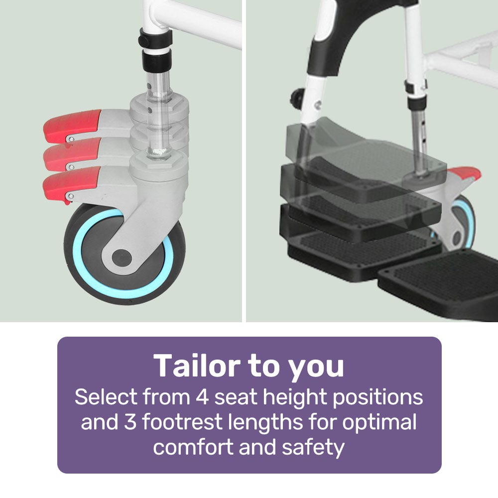 The 5-inch solid tyres roll smoothly and have 360 degree motion. The easy-to-use brake pedals lock the wheels, so the chair remains stable getting on and off of it, and makes it convenient room-to-room transportation.