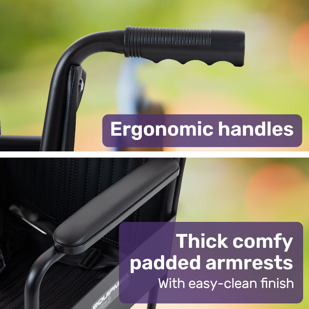 Designed for user comfort, the Equipmed Transport Wheelchair features swing up footrests for effortless access, extra wide 51cm seat, and plush padded armrests. The easy-clean vinyl material ensures quick maintenance, while the backrest storage pouch is handy for storing favourite reading material. Adjust the seat belt for a secure fit during short-term mobility needs, whether it’s a trip to the park, doctor’s appointments, or navigating airports with ease.