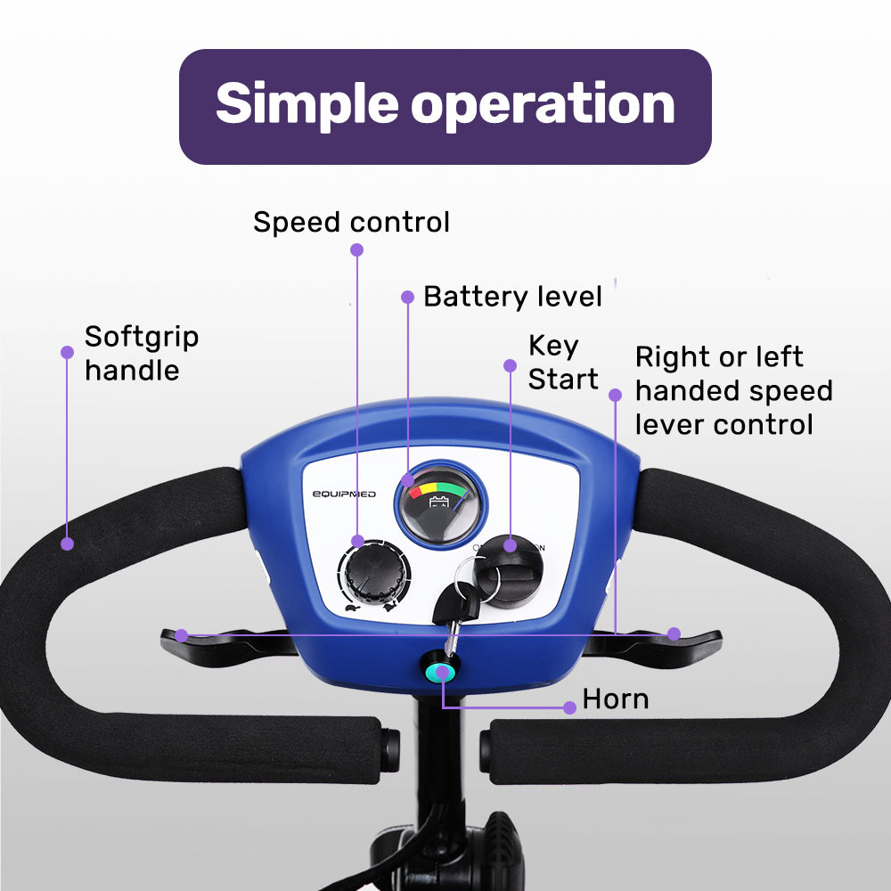 The Equipmed mobility scooter can be transported in the boot of a car with the folding handles and easy removal of the seat. The battery is also detachable for an easier to manage weight.
