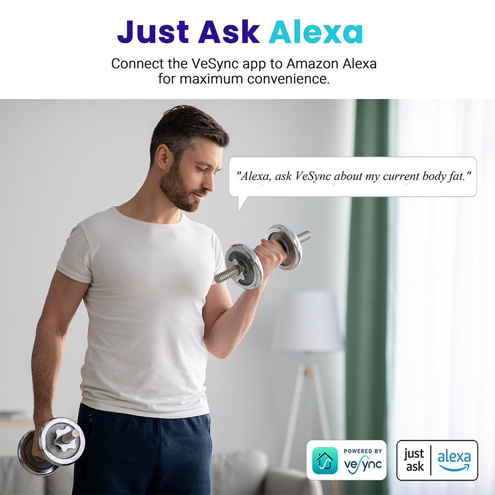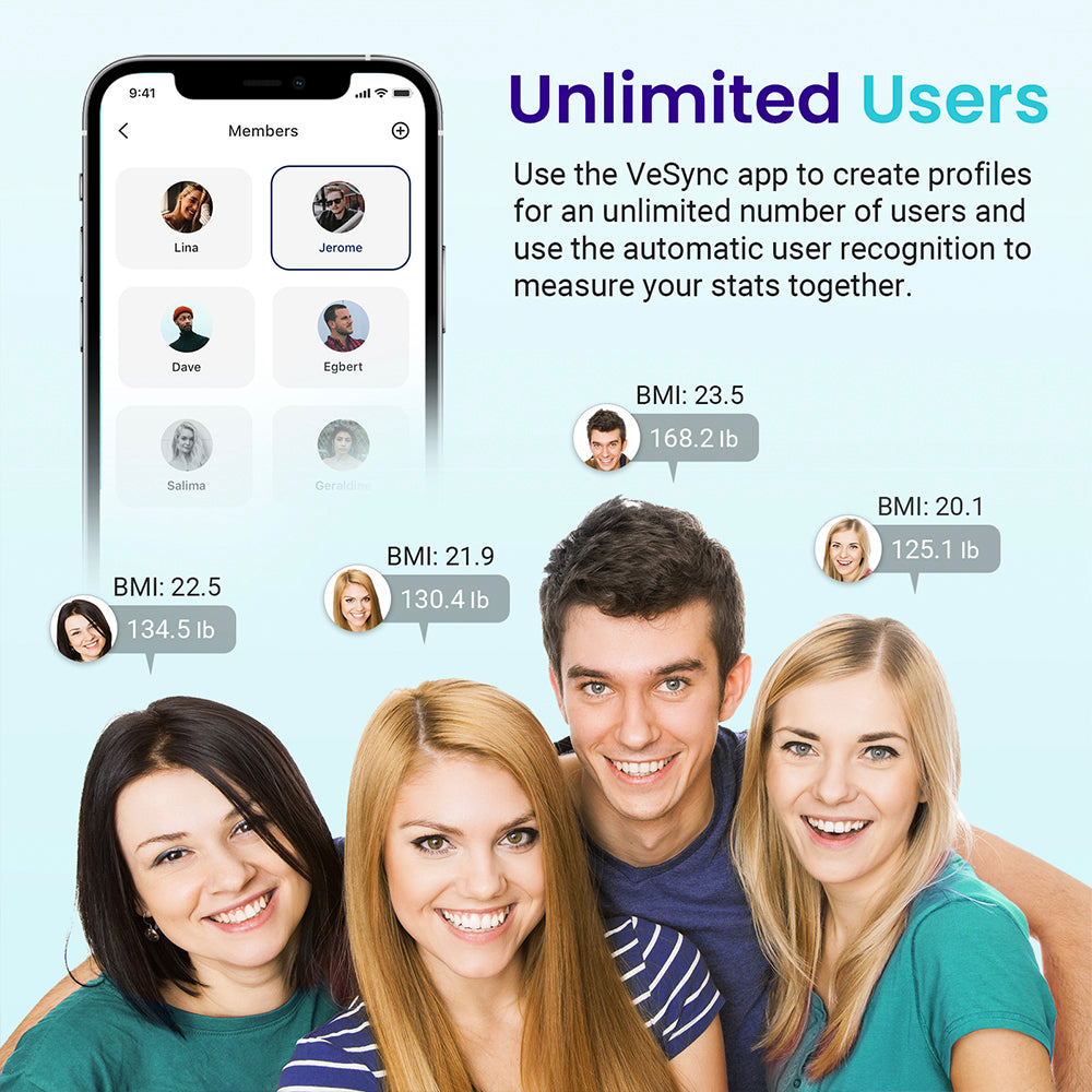 Designed for convenience, the scale’s sleek 30 x 30 cm slim design makes it a seamless fit in any space. The clear LED display (7.4 x 3.3cm) offers easy readability, enhancing your monitoring experience. Seamlessly sync your data via the VeSync App, providing you with a comprehensive overview of 13 different health metrics.