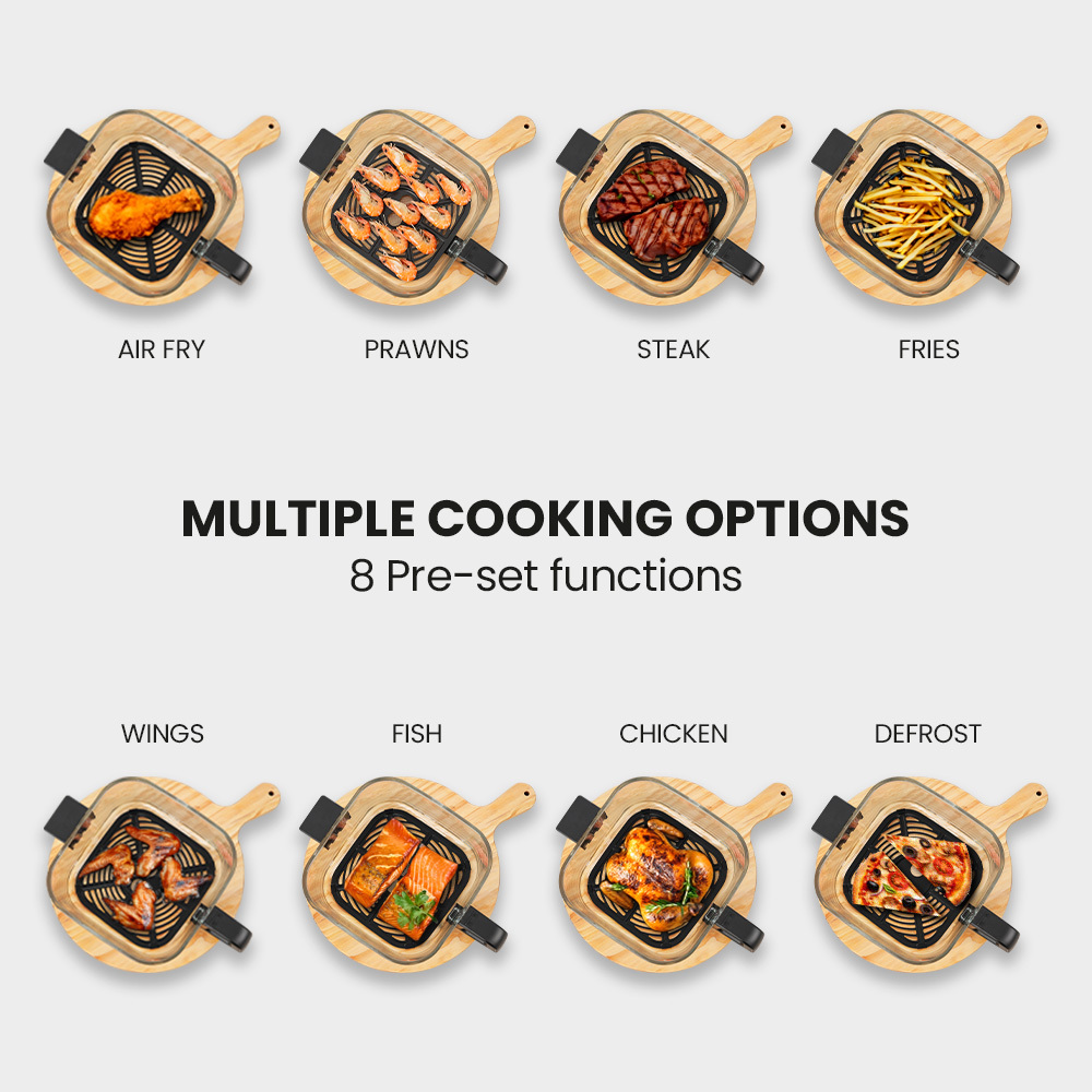 The advanced 360° air-circulation system delivers even cooking with up to 80% less fat, creating perfectly crispy results. The durable tempered glass container offers 360° visibility for monitoring progress, and its dishwasher-safe components make clean up effortless. Compact yet spacious, this air fryer is ideal for any kitchen, combining convenience with healthier cooking.