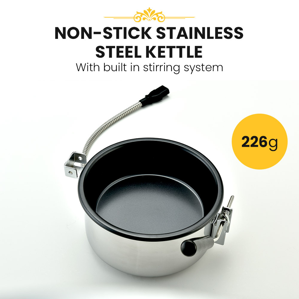 Its 226g non-stick kettle with built-in stirring system and stainless steel heating deck provide you and your customers with perfectly consistent popcorn everytime! The Eurochef Popcorn Maker couldnt be any easier to use; simply pour the kernels in and start popping while you watch the profits roll in!