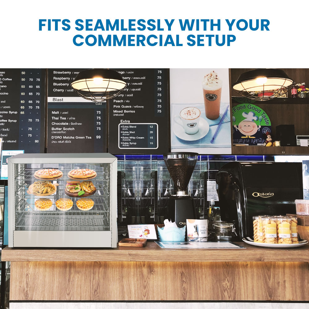 The EuroChef has all the features you need to keep up with demand. Heat resistant handles on the sliding glass doors ensure easy access for staff throughout the day. The four large 57x30cm removal stainless steel shelves are easy to clean and provide plenty of space for all of your food products. This EuroChef Food Warmer Display is the perfect choice for cafes, bakeries, food stands and other food vendors that need to keep food presentable and ready to serve.