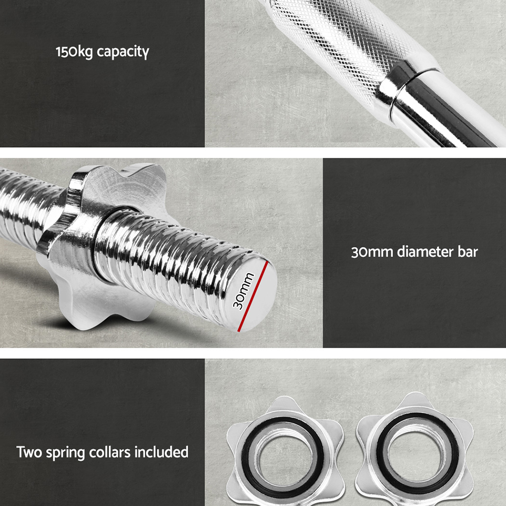 Finding an economical way to maintain your fitness? Do it at home with this solid chrome plated steel Barbell Bar. You can use the bar with most standard 31mm – 35mm hole weight plates, and it holds up to 150kg so you can work out at any weight.