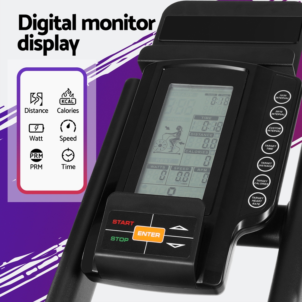 Never miss a workout with an Everfit Air Bike. Our gym-quality equipment fits perfectly in your home, helping you achieve your fitness goals one day at a time. This dual-action exercise bike features an air resistance system with a 4.6kg heavy-duty steel flywheel and dynamic moving arm cranks for a full-body workout. Adjust the thick padded seat horizontally, vertically, backwards and forwards for the ideal fit. The digital display track multiple fitness parameters where you can see them. Non-slip pedals with protective straps keep your feet firmly in place, while built-in wheels make the bike easy to move. Best of all, an in-built phone/tablet holder allows you to watch your favourite movies, shows or workout mixes as you exercise. So what are you waiting for? Start your very own home gym today with an Everfit Air Bike.