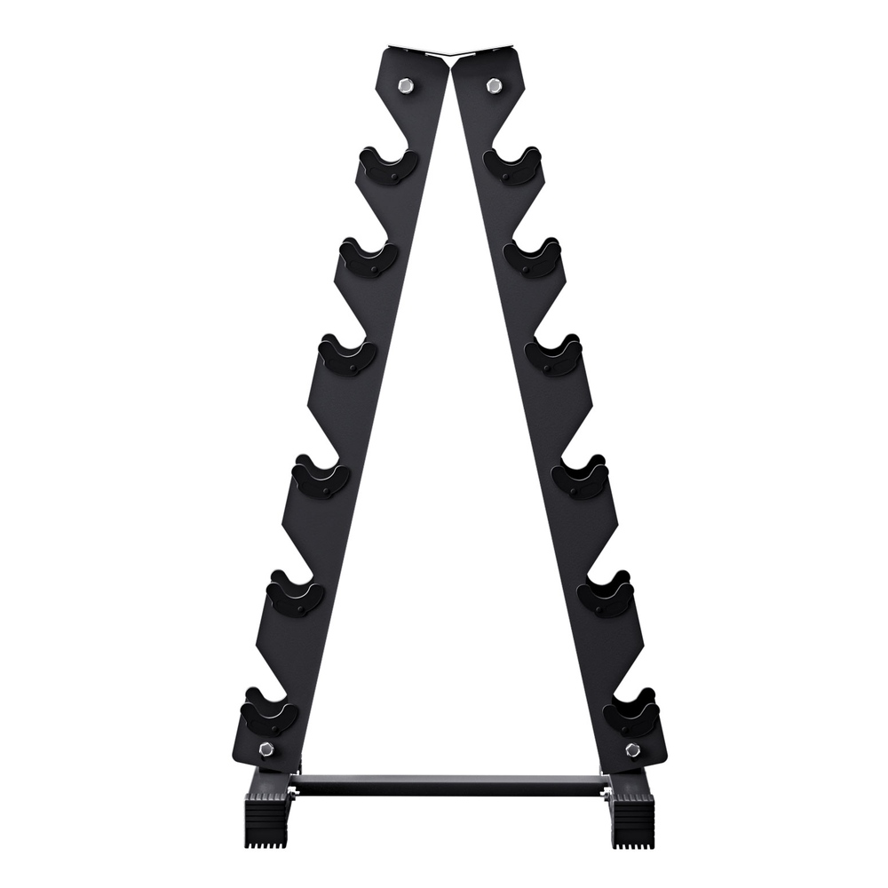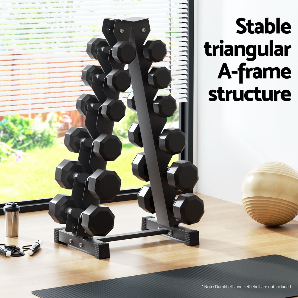 Organize your gym with our 6-Tier Dumbbell Rack. It features a stable A-frame triangular design that can hold up to 200kg of weights, offering a practical storage solution for your workout equipment. Its easy and safe design ensures stability during rigorous workouts, while its compact size allows for space-saving storage. The rack is easy to install, so you can get your gym up and running in no time at all. Made with high-quality materials, our dumbbell rack is durable and perfect for any home gym or fitness studio. Keep your weights organized and easily accessible with our smart storage solution.