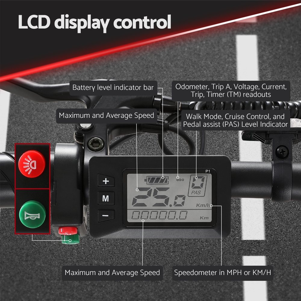 Our Electric Bike is the perfect commuter solution. With a quick folding design, it is highly portable and easy to store. The powerful 250W motor coupled with a 36V 10.4Ah removable rechargeable Li-ion battery allows for speeds up to 25km/h, while a range of up to 60km on a single charge will take you anywhere. A Shimano 7-speed shifter and derailleur ensures a comfortable, smooth ride on any terrain with front and rear disc brakes for easy stopping ability. The aluminium alloy frame, comfortable seat, LCD panel, built-in headlight and reflector make for an enjoyable, hassle-free ride. Furthermore, the bike is water-resistant for easy transportation all year round.