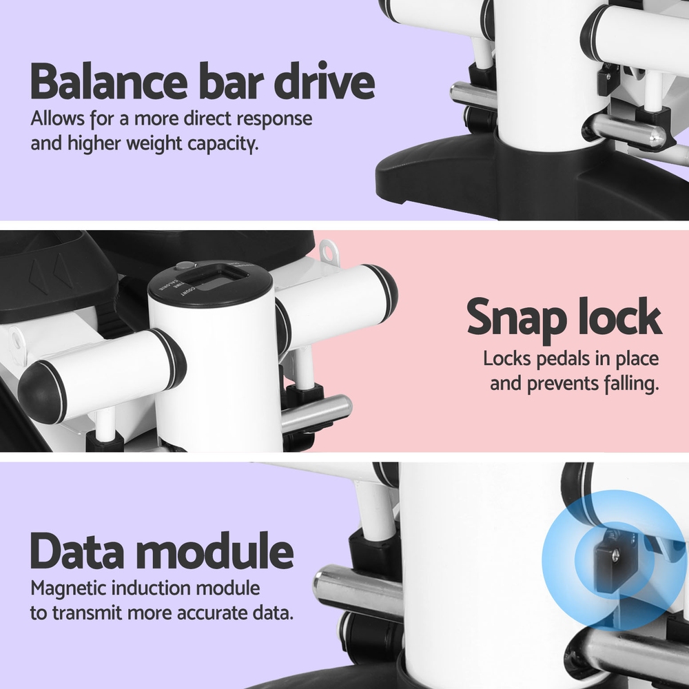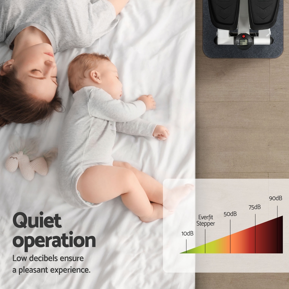 Step up your fitness game with a Mini Stepper from Everfit. Target your thighs, calves, waist and hips without leaving your home. The Mini Stepper is portable thanks to its miniature size, making it perfect for use under your desk, in the living room, or on the go. The stepper has an anti-slip pedal surface and edge for safety and stability, and your package includes a non-slip rubber mat to keep everything in its place. The stepper has a high weight capacity of 150kg and operates quietly for a pleasant exercise session that wont disturb your guests or family. The LCD screen will show you all your fitness data as you exercise, and the detachable soft pedal pad is easy on your feet and easy to maintain. It requires no assembly and folds neatly away when not in use. Best of all, the stepper comes with two bonus resistance ropes so you can perform a variety of exercises. Get fit today from the comfort of your home or office with the versatile Everfit Mini Stepper.