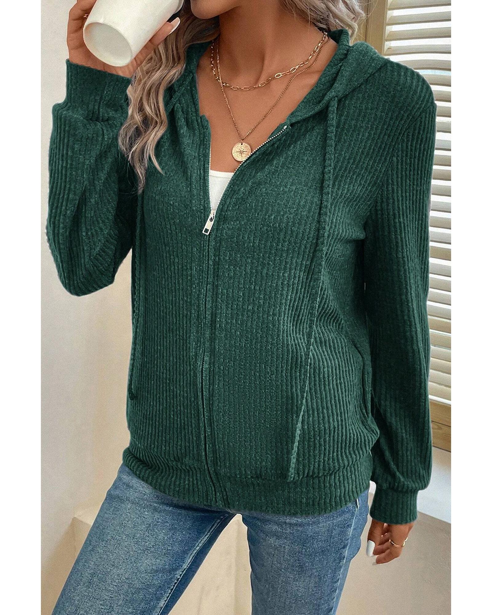 Evergreen Ribbed Zip Up Front Drawstring Hoodie – S
