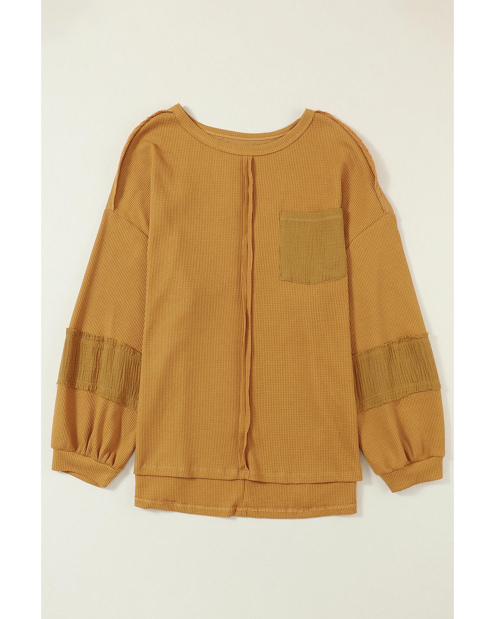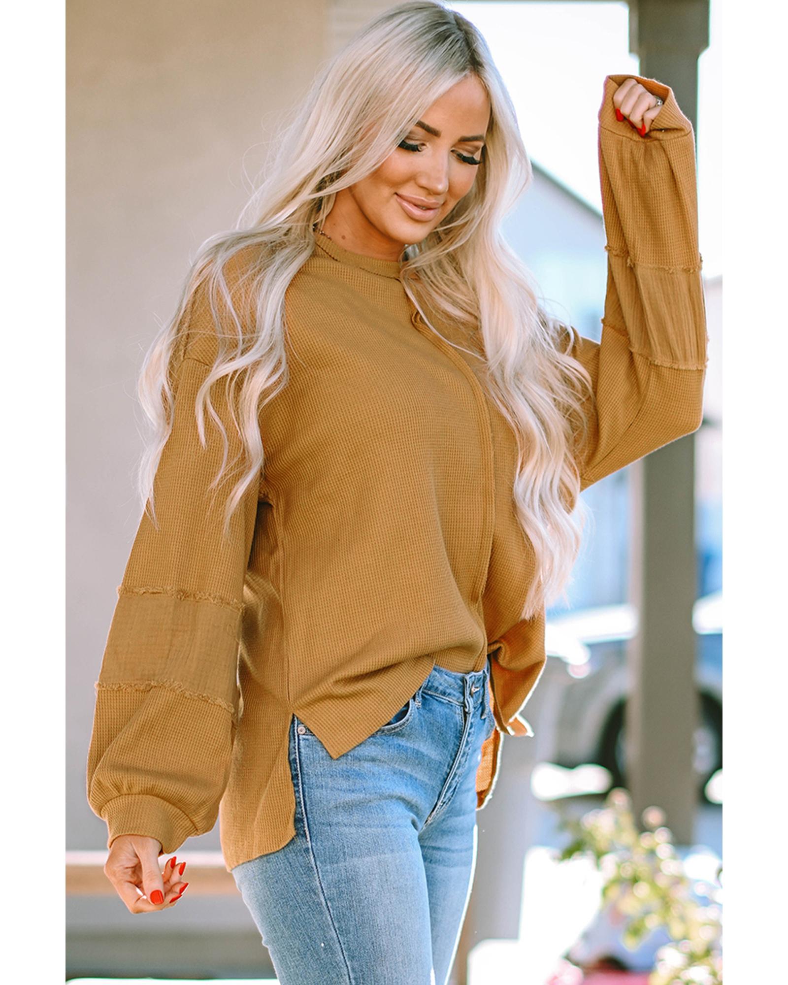 Exposed Seam Patchwork Bubble Sleeve Waffle Knit Top – 2XL