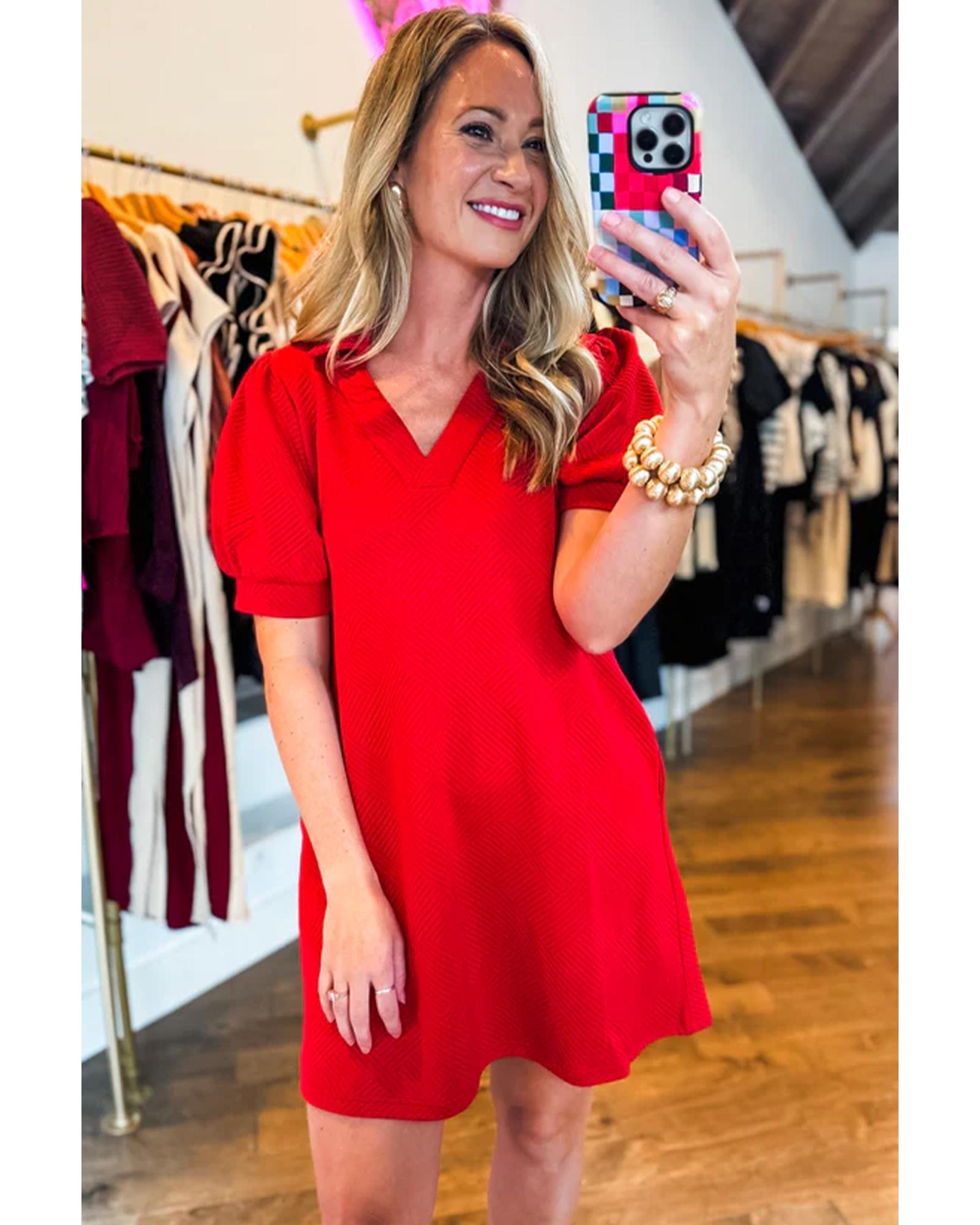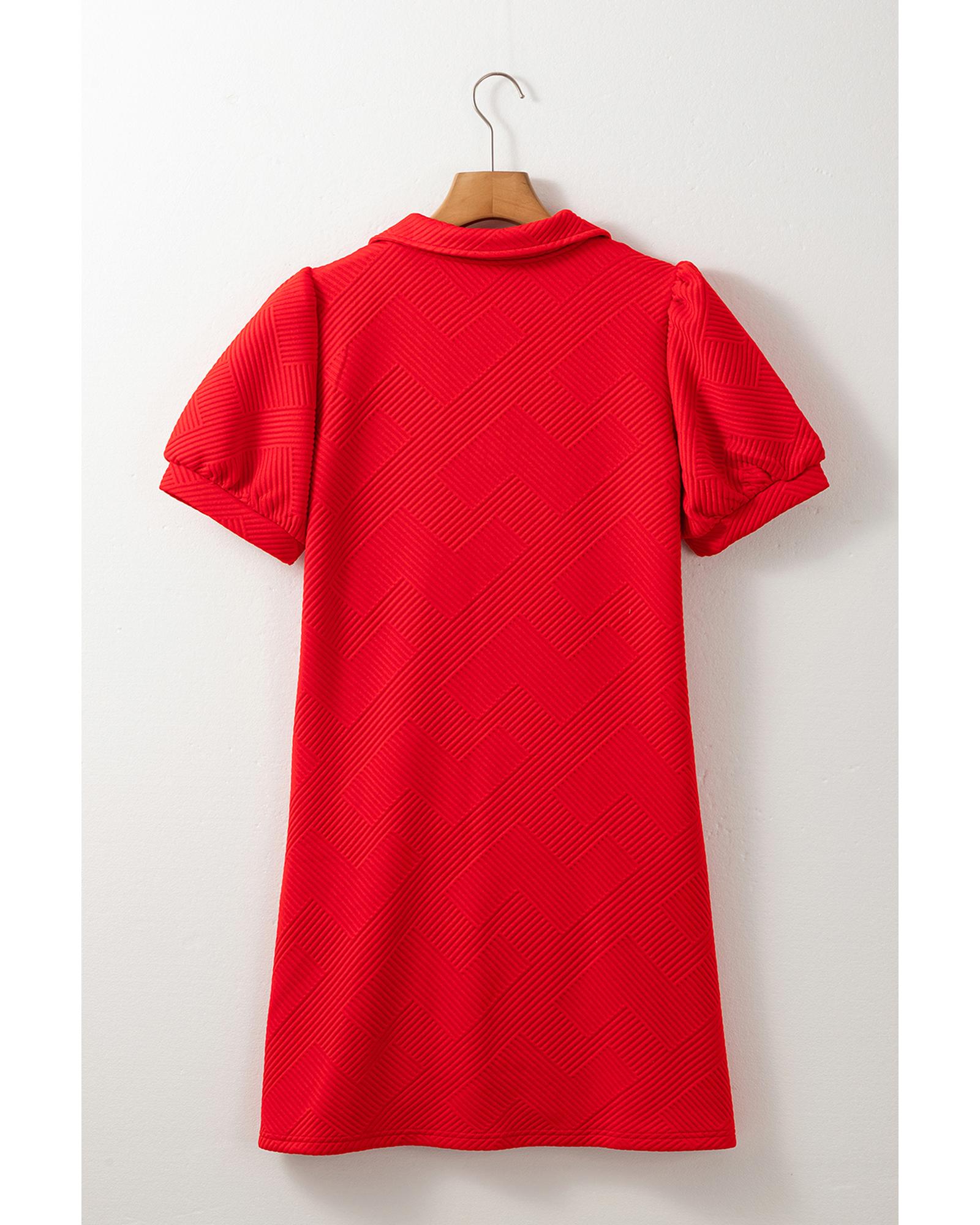 Fiery Red Textured Collared V Neck Puff Short Sleeve Shift Mini Dress – S