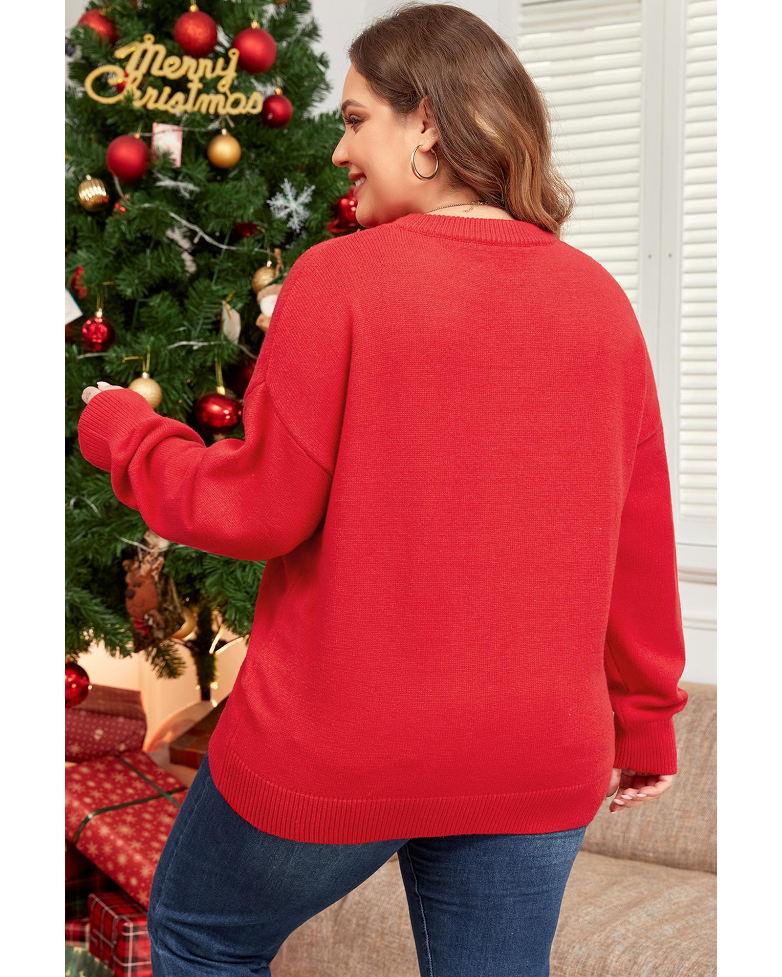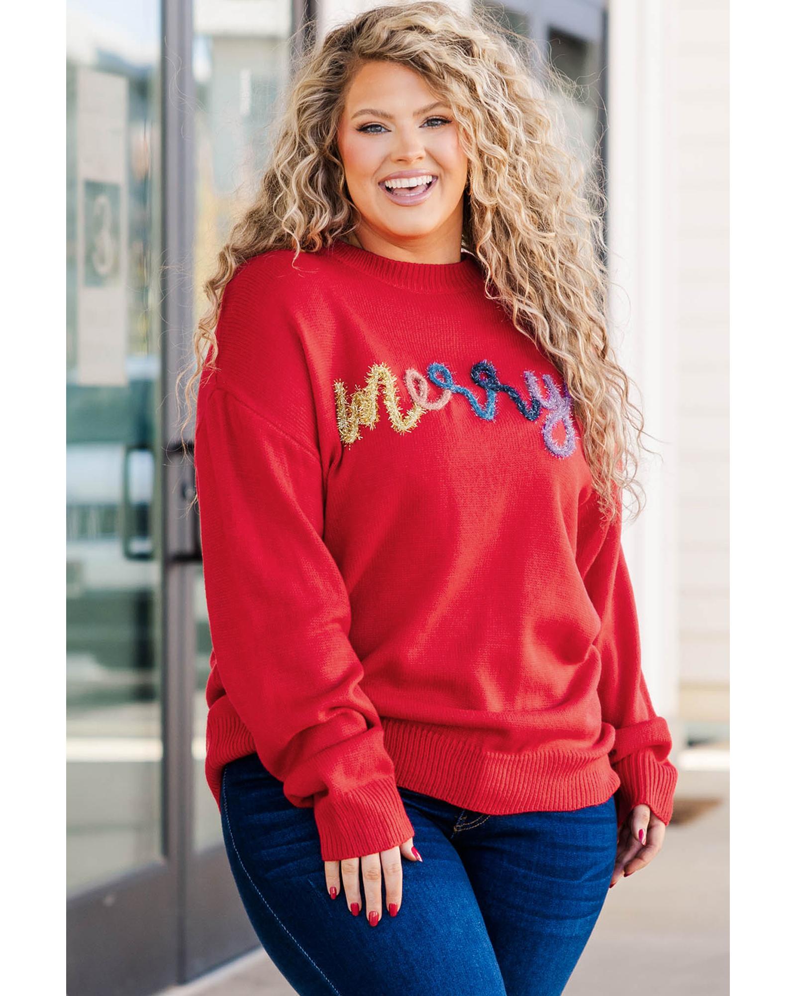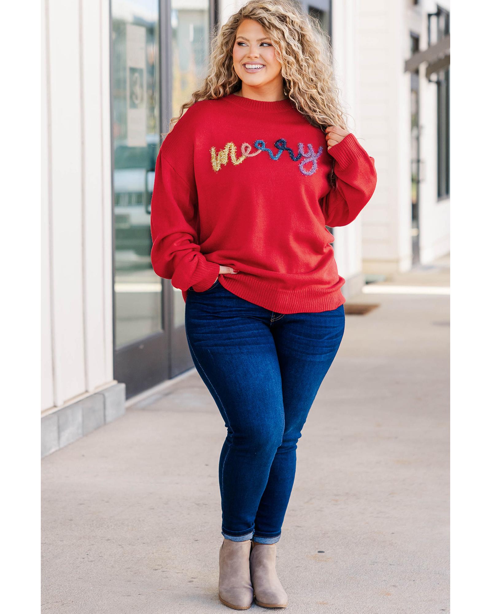 Fiery Red Tinsel merry Pattern Drop Shoulder Plus Size Sweater – 2X
