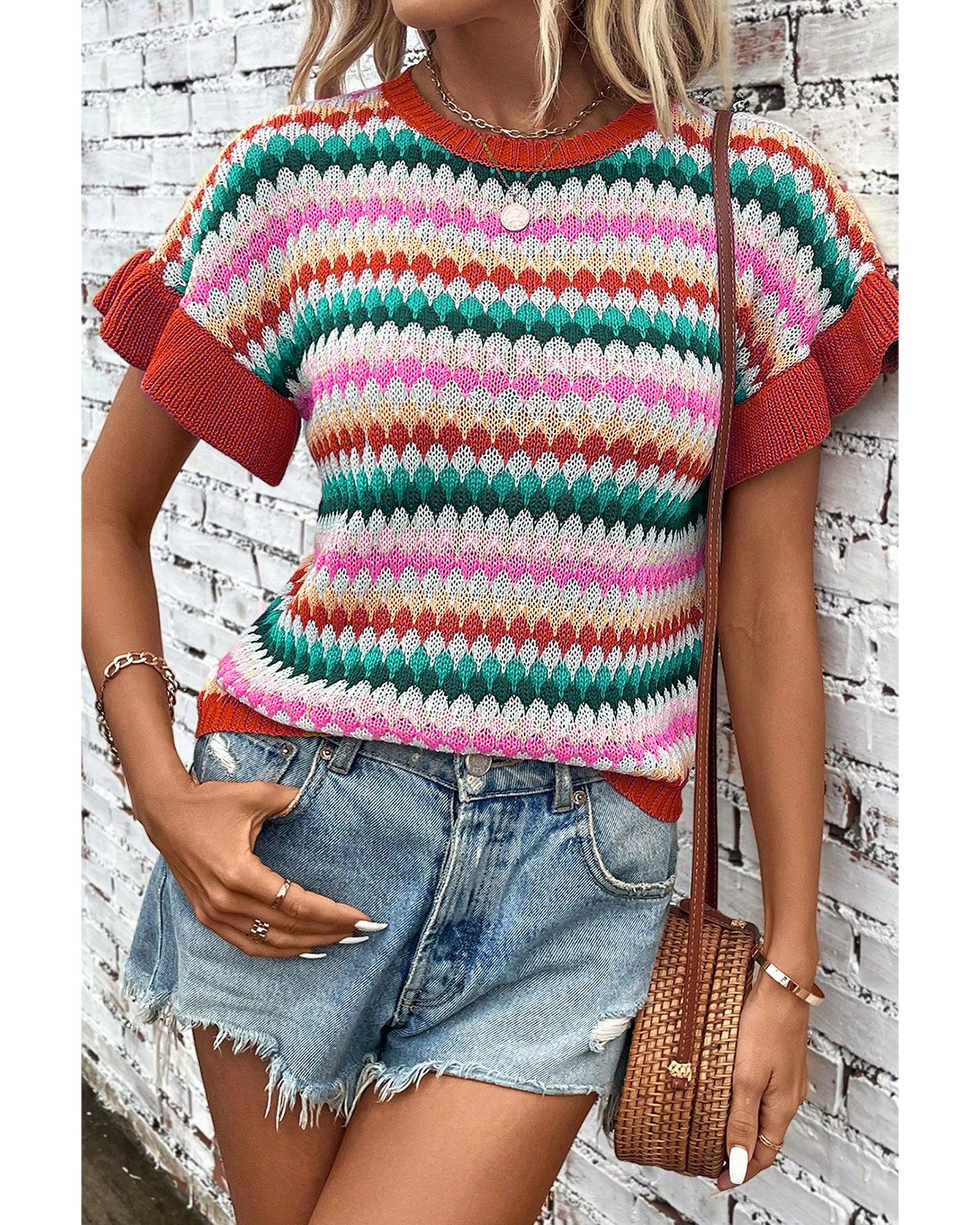 Fiery Red Trimmed Ruffle Sleeve Colorful Textured Sweater – M