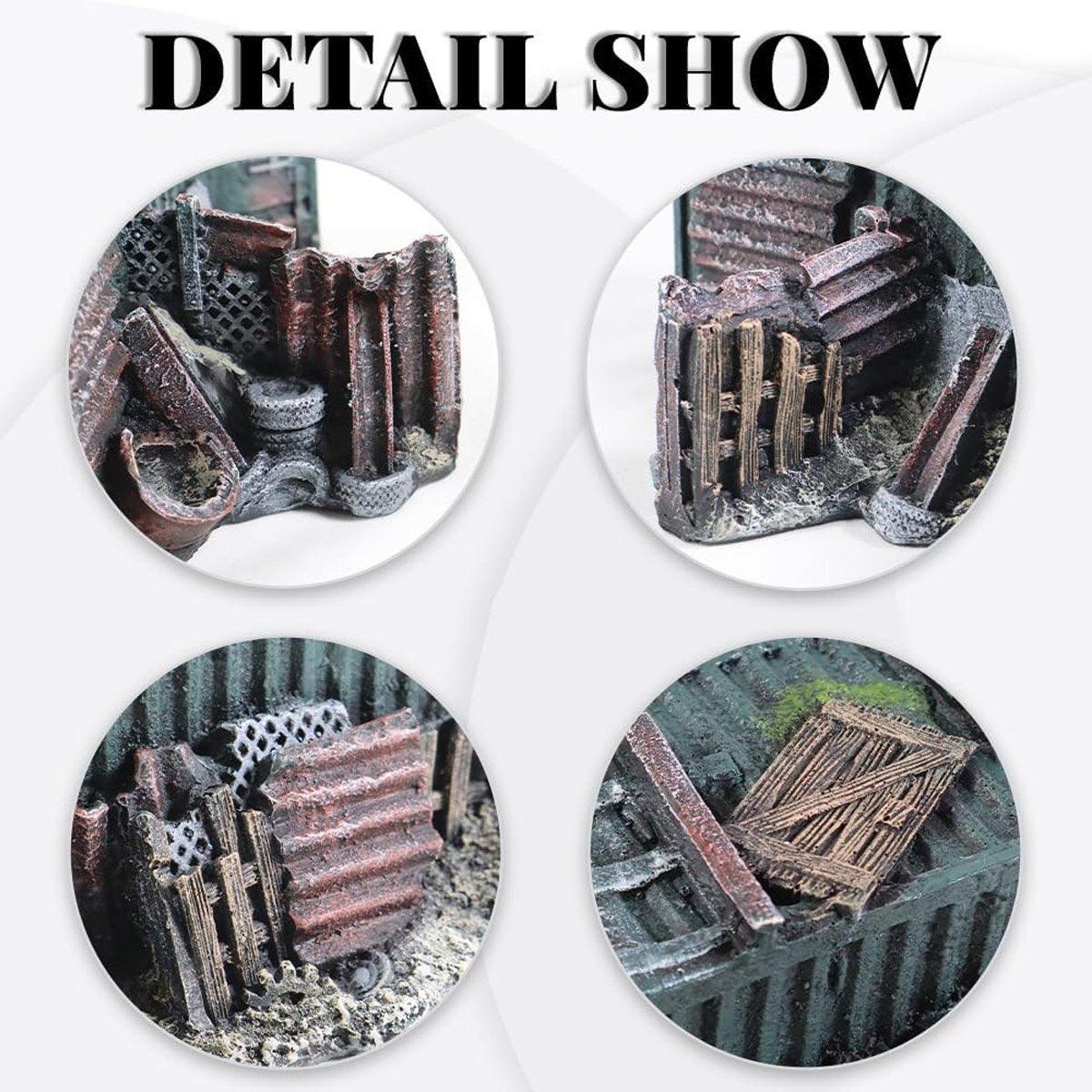 This aquarium decoration features a realistic wreckage container design that creates a unique and immersive underwater environment. Ideal for fish and shrimp, it offers multiple hiding spots that reduce stress and help them feel secure. Made from durable, non-toxic grey resin, this decoration is suitable for both freshwater and saltwater tanks. Its lightweight structure makes it easy to place, while its climbing-friendly design is perfect for small climbing pets.