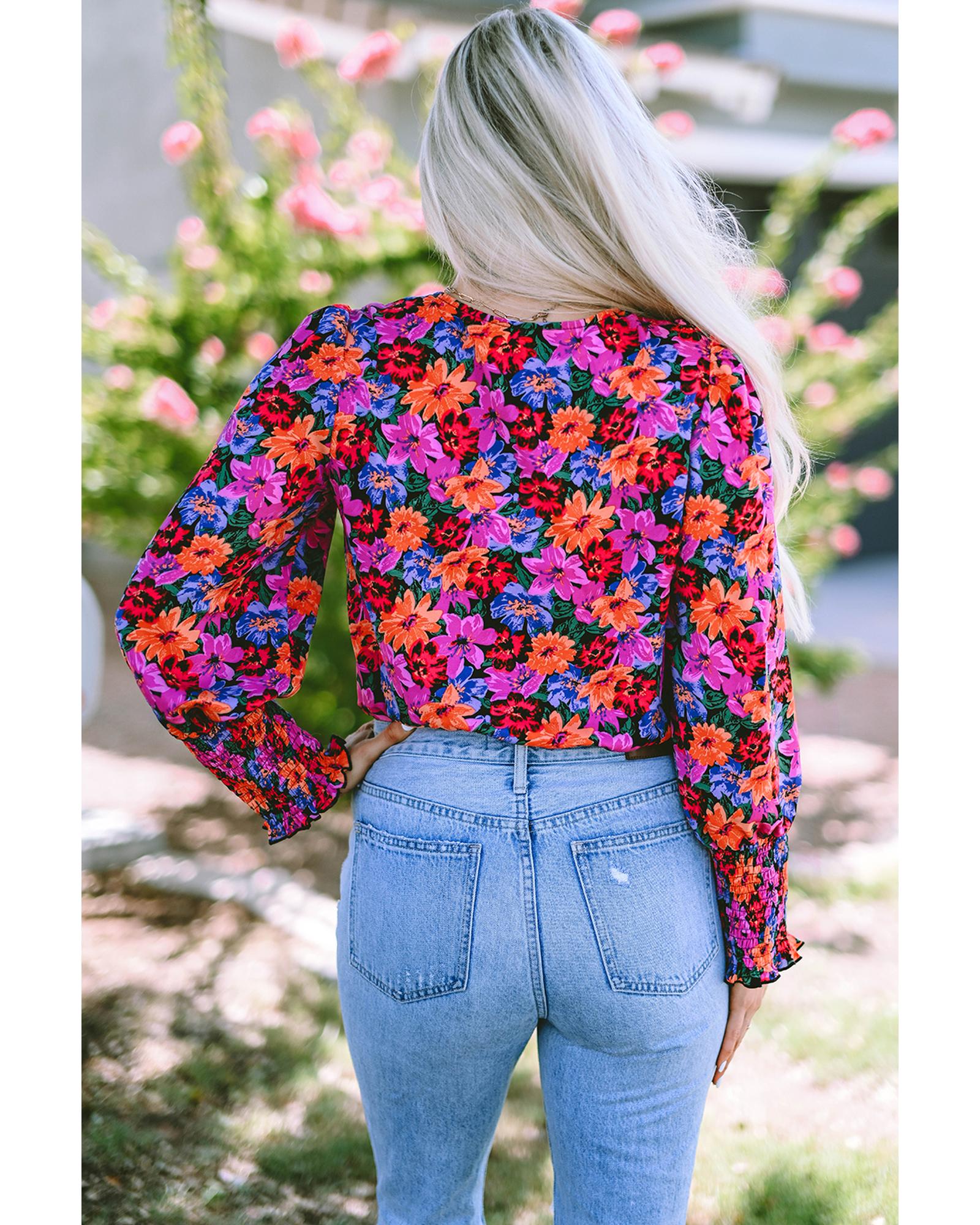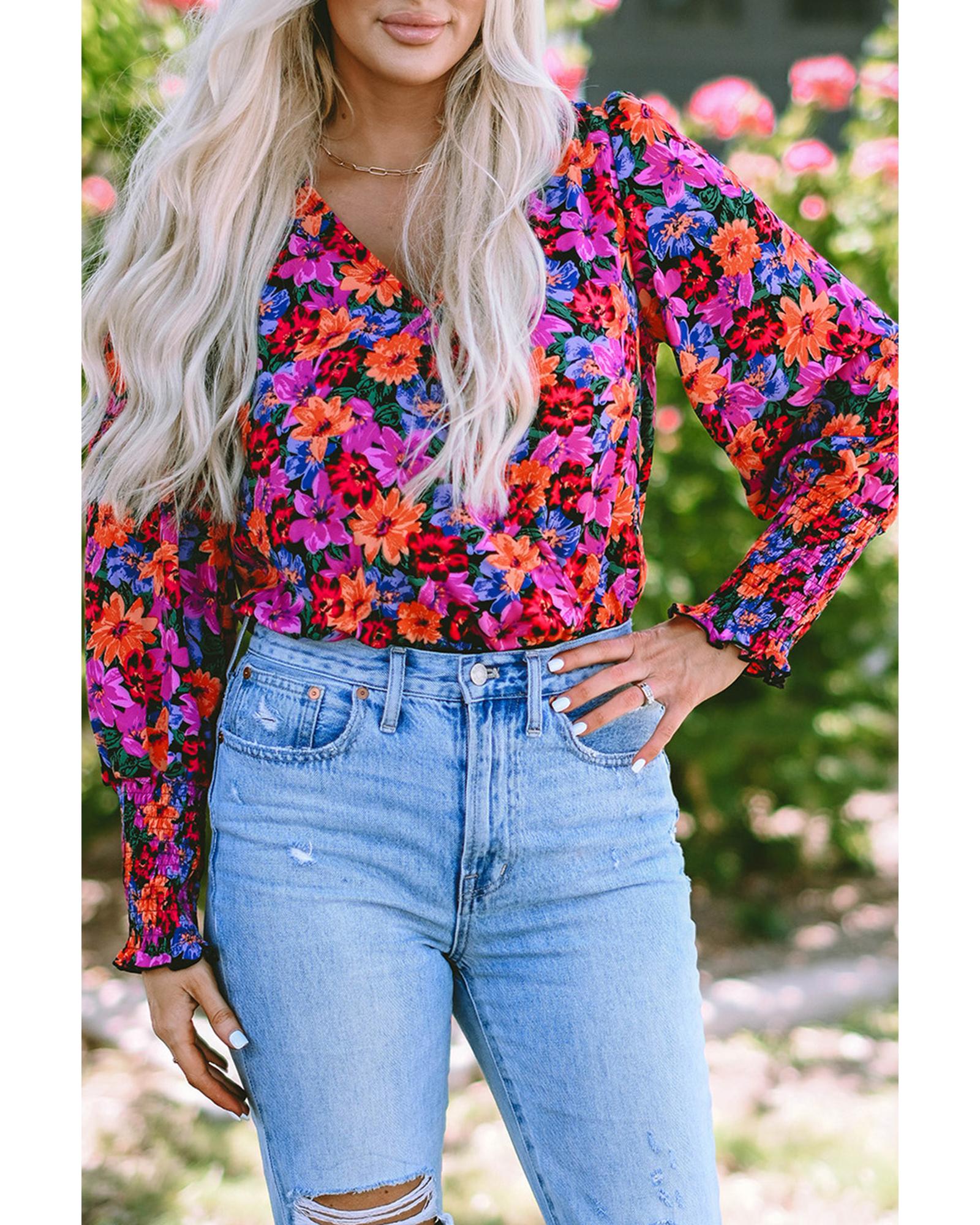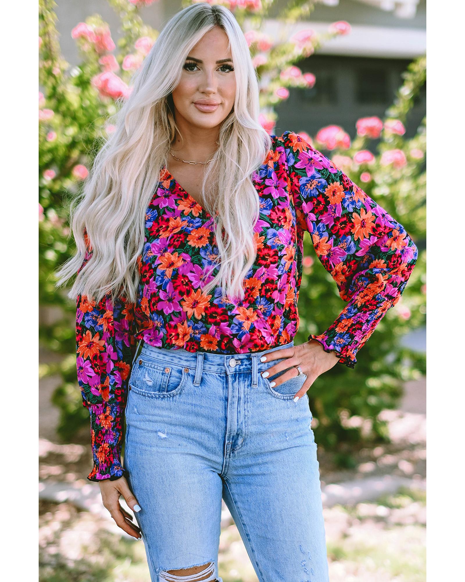 Floral Print Wrap V Neck Long Sleeve Bodysuit – L