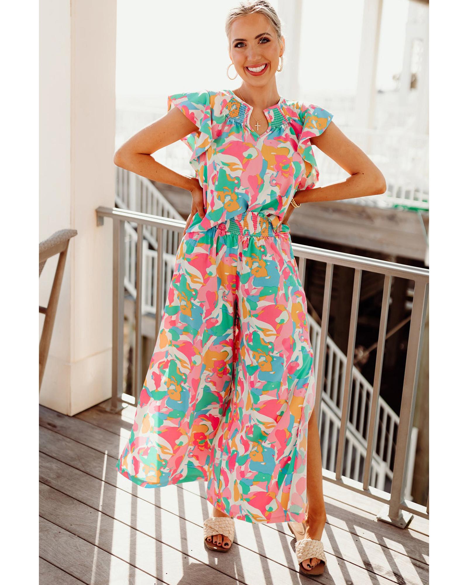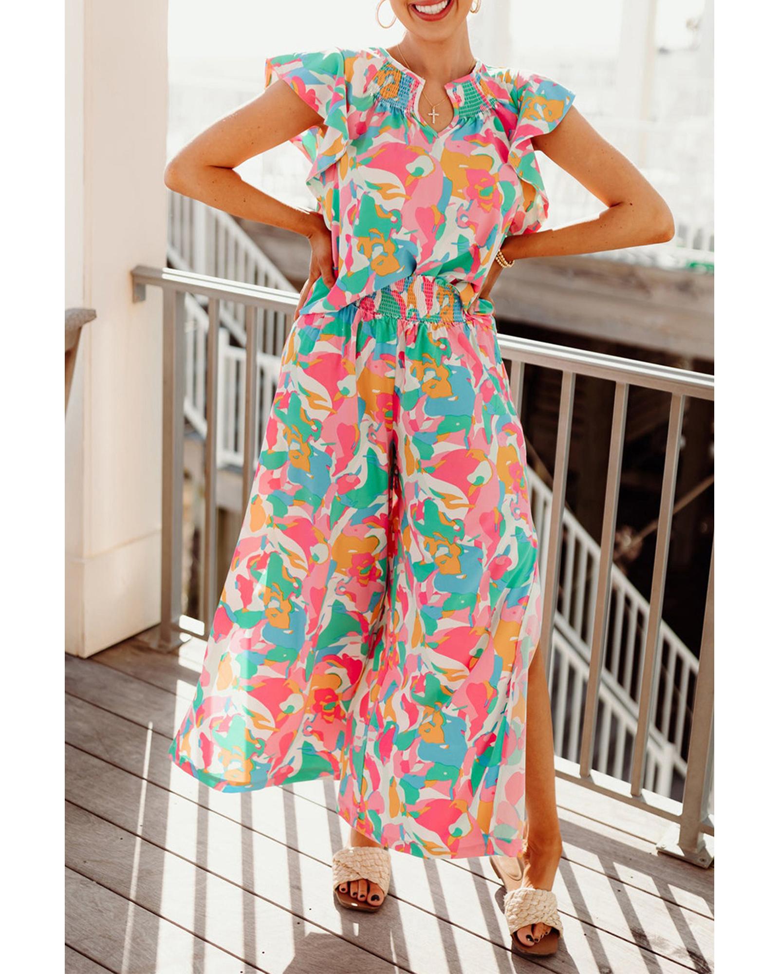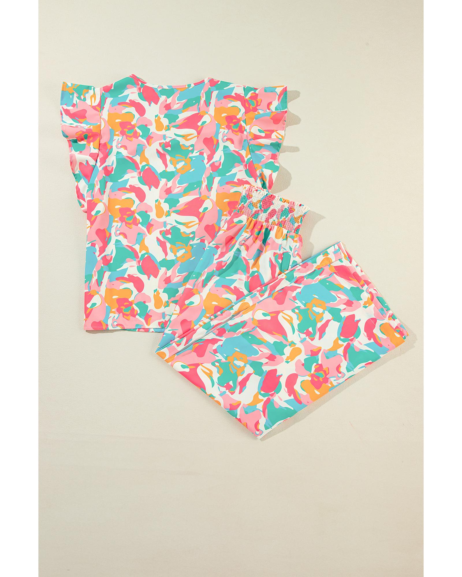 - Floral Ruffled Sleeve Top and Smocked Wide Leg Pants Set