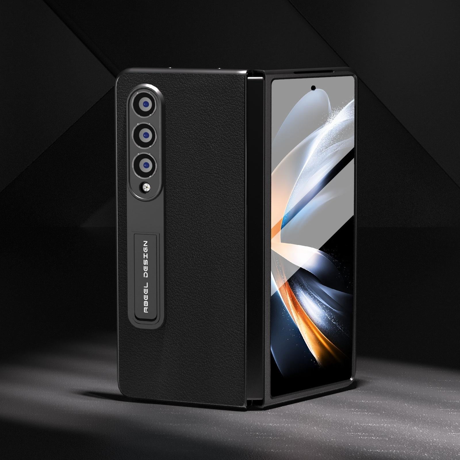 For Samsung Galaxy Z Fold4 5G Leather Phone Case With Holder – Wave Design – Black