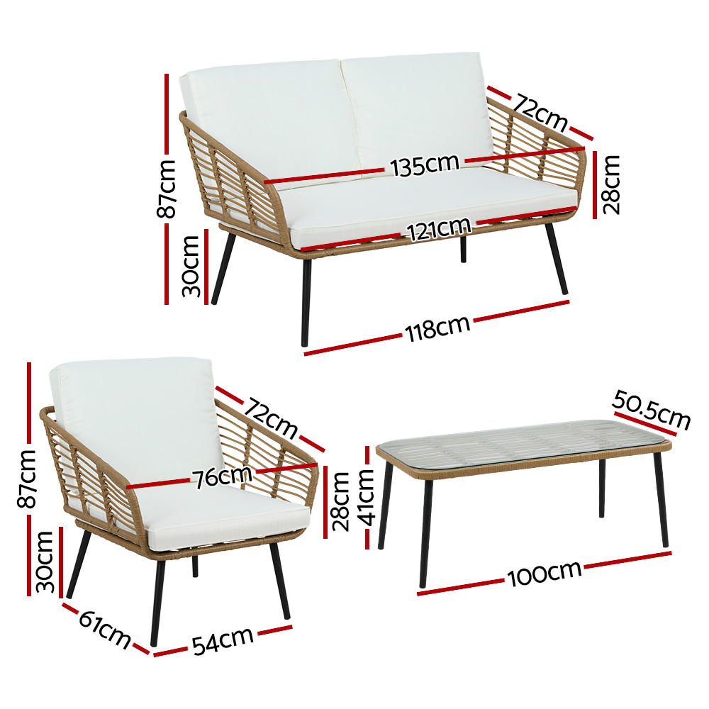 Looking to create a chic and gorgeous outdoor setting? The Gardeon 4-piece rattan outdoor lounge set is a must purchase. It will liven up your outdoor space and help you achieve an elegant space where you can enjoy day and night and summer and winter. This 4-seater set comprises of two single sofas, one 2-seater sofa, and a matching centre table. You can arrange them in multiple ways to suit your space. Its beautiful and versatile design makes it perfect for both indoor and outdoor use. All the seat and back cushions come with 8cm thickness and high-density foam padding that ensures your comfort always. Additionally, the removable cushion covers are water-resistant and UV-resistant to suit different seasons. Furthermore, our outdoor set features a lovely handwoven rattan weave for a touch of tropical charm and decorative effect, and the UV-resistant PE wicker makes this lounge set perfect for all-weather use. The large table with 5mm thick tempered glass top, non-slip suction pads, and durable powder-coated frame ensures strength and durability. This rattan outdoor set will withstand the test of time due to its durable and sturdy structure and powder-coated steel frame. You can create a praise-worthy spot with just a little creativity that will wow your guests. Shop it for your home today.