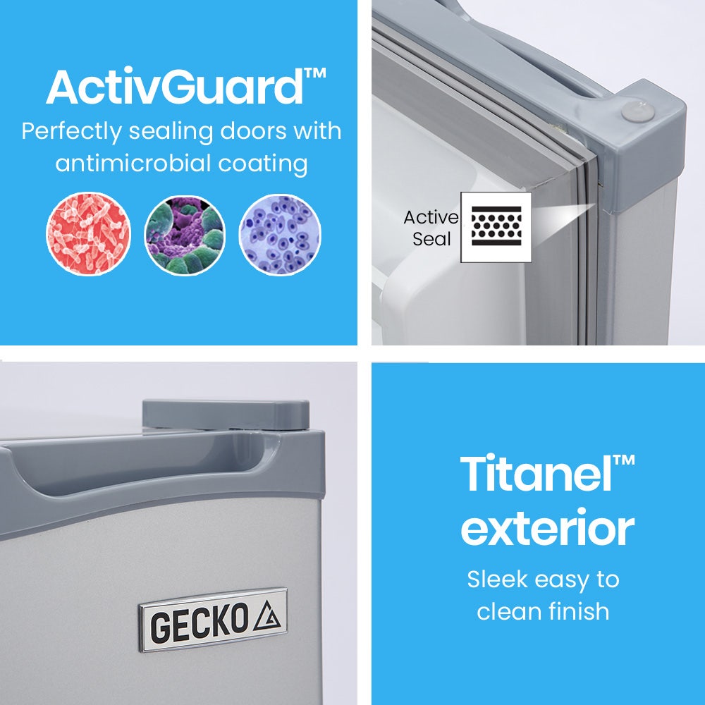 The Gecko Camping Fridge Freezer is designed to perform in harsh Australian conditions with quality compressor technology and thick insulation for fast cooling and operation in ambient temperatures of up to 38 degrees! The Gecko range features ActivSealTM technology which consists of perfectly sealing doors with an anti-microbial coating to inhibit the growth of germs. The Gecko also has flush recessed handlesa great feature for confined spaces. All this is wrapped in a sleek TitanelTM metal finish, ensuring it will look right at home, anywhere!