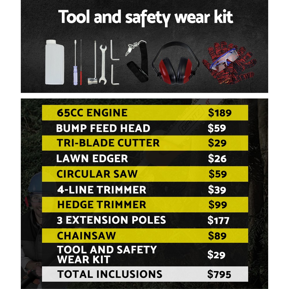 Giantz 65CC Pole Chainsaw Hedge Trimmer Brush Cutter Whipper Snipper 9-in-1 4.3m