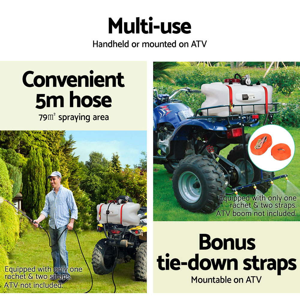 Including a 5m chemical grade hose and rear boom sprayer, it allows you to do broad spraying while hand-held spray nozzle to do spot spraying while riding or walking. This weed sprayer is built with UV stable, to withstand under the operation of heat and sun of Australian weather. A great mobile solution to pest and weed treatment for your home, garden and farm.