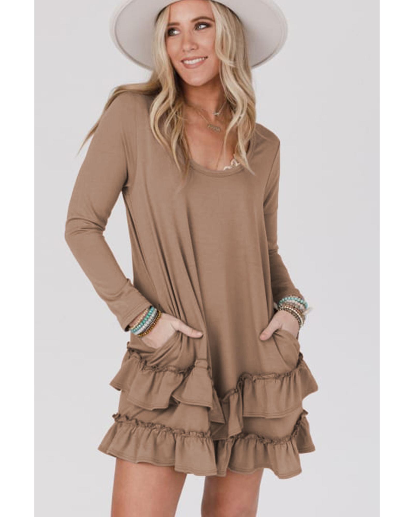 Goat Scoop Neck Tiered Ruffled Hem Long Sleeve Mini Dress – L