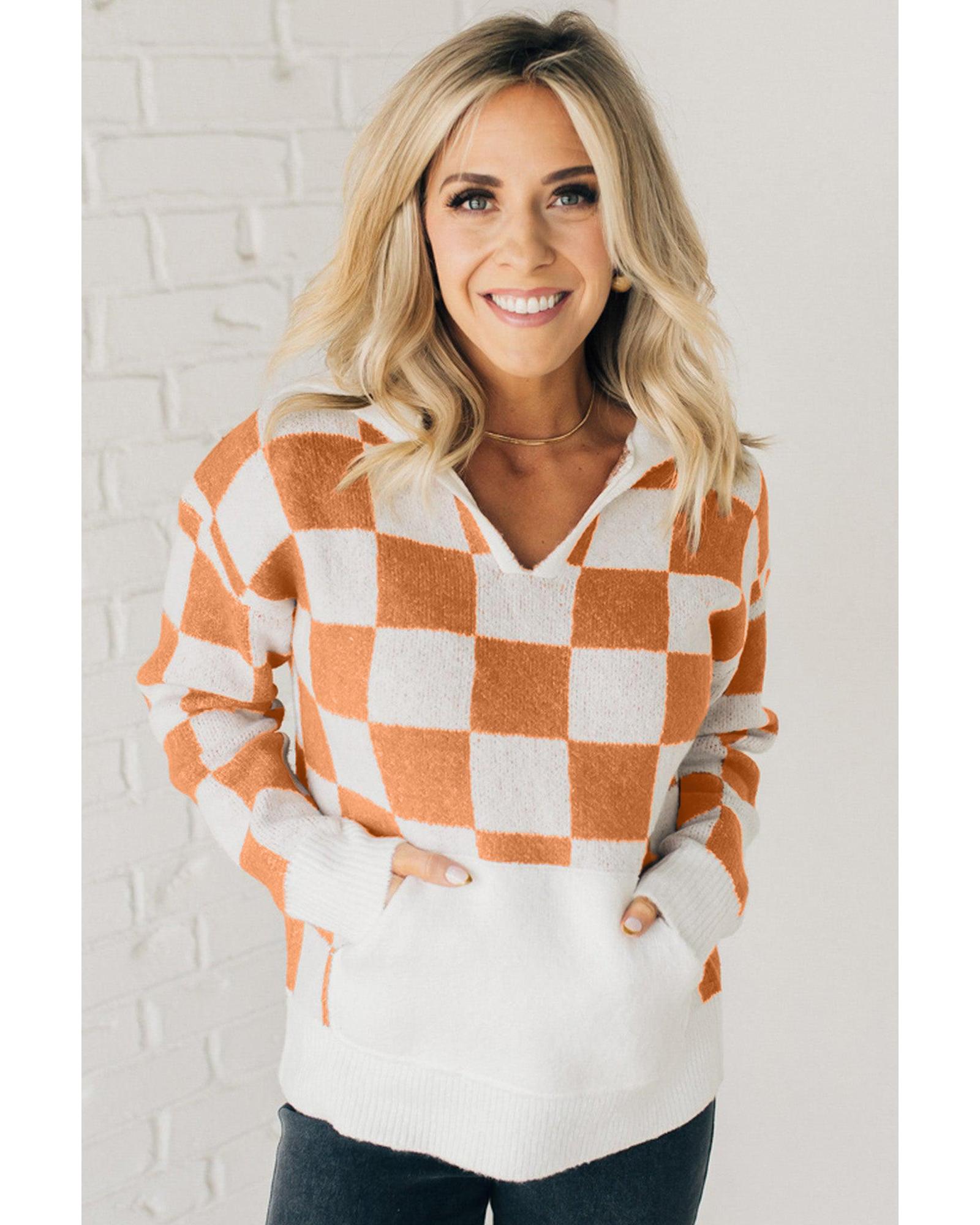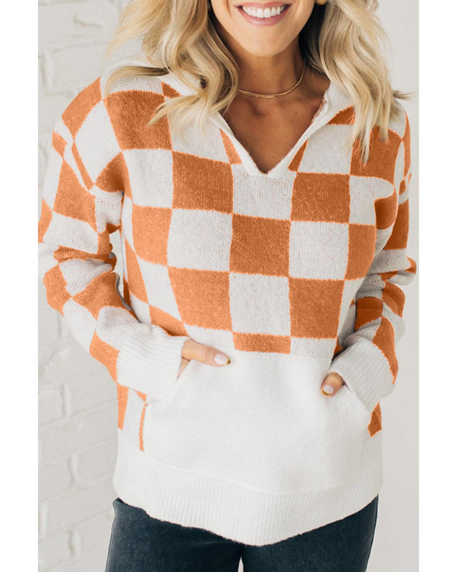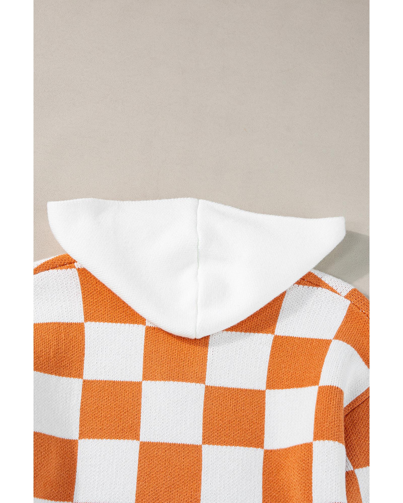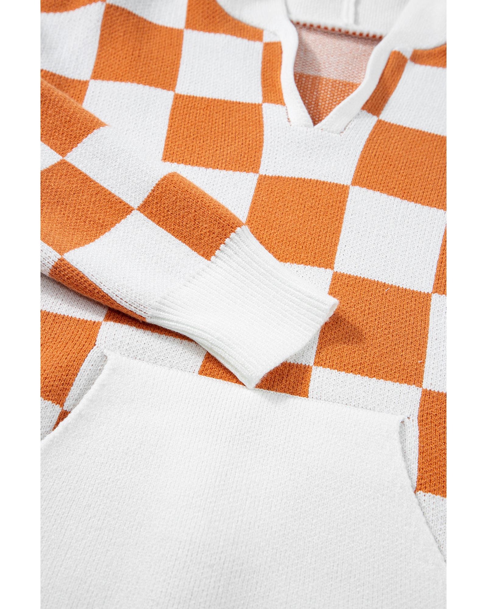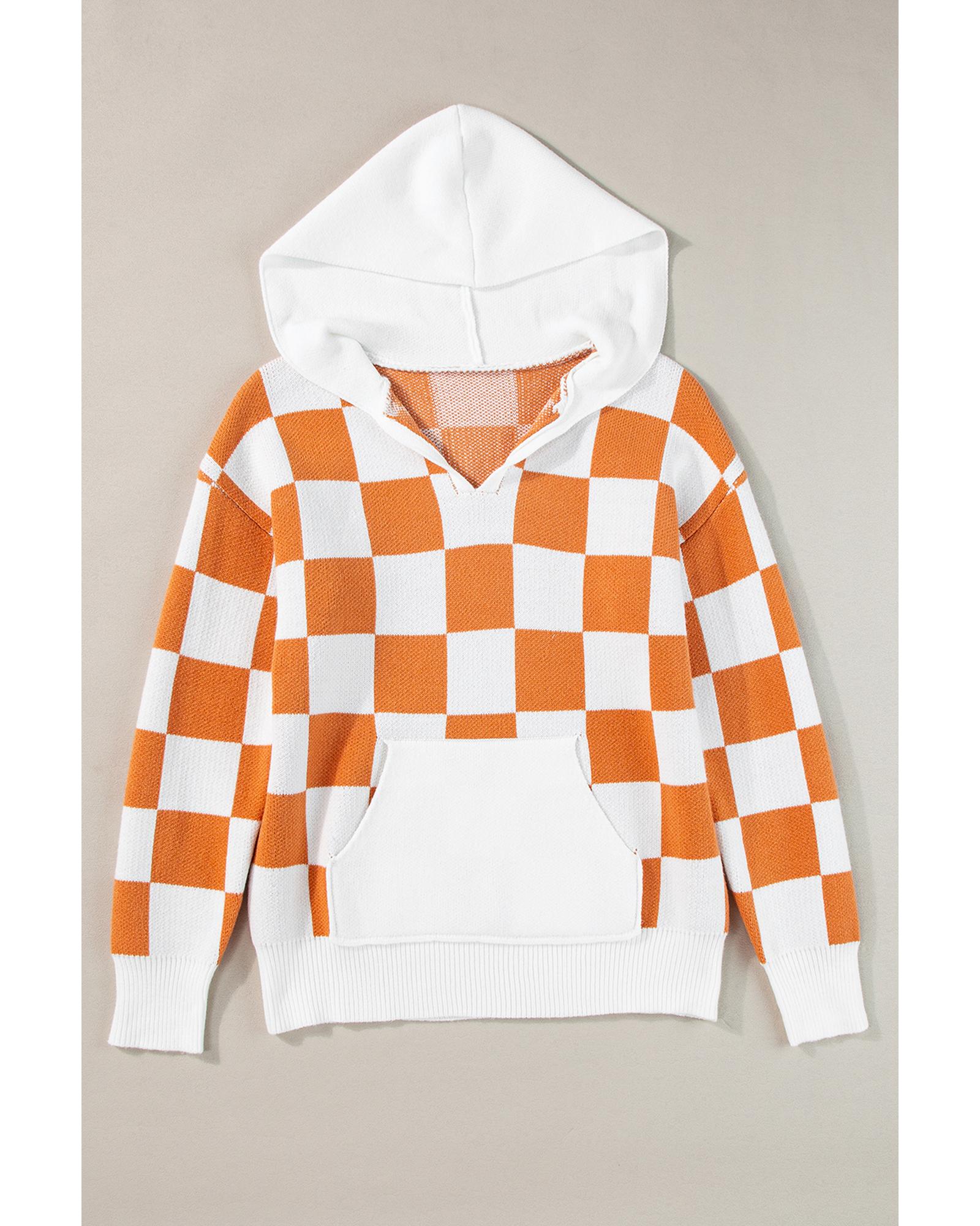 Gold Flame Checkered Split Neck Contrast Kangaroo Pocket Hooded Sweater – L