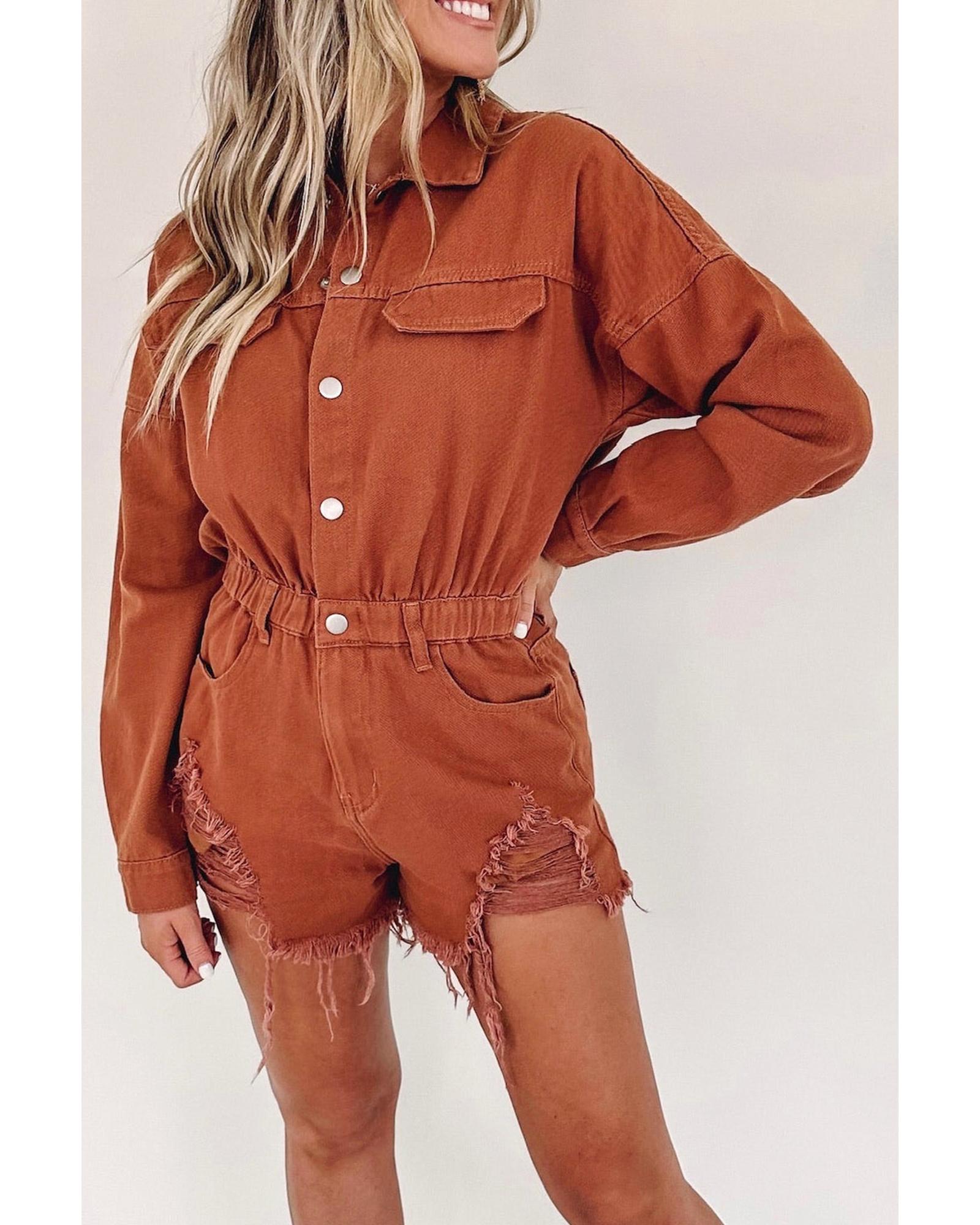 Gold Flame Long Sleeve Snap Buttons Distressed Denim Romper – L