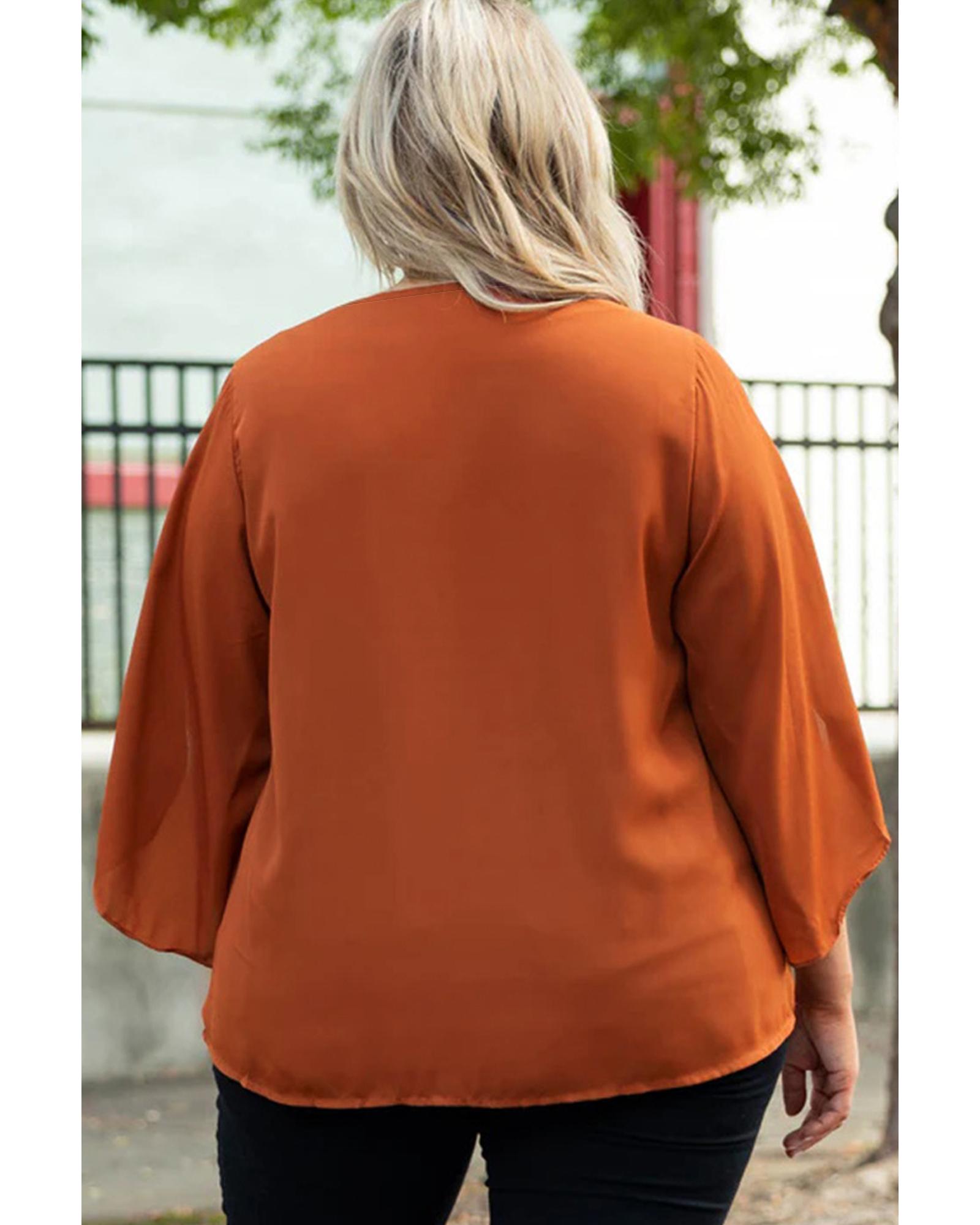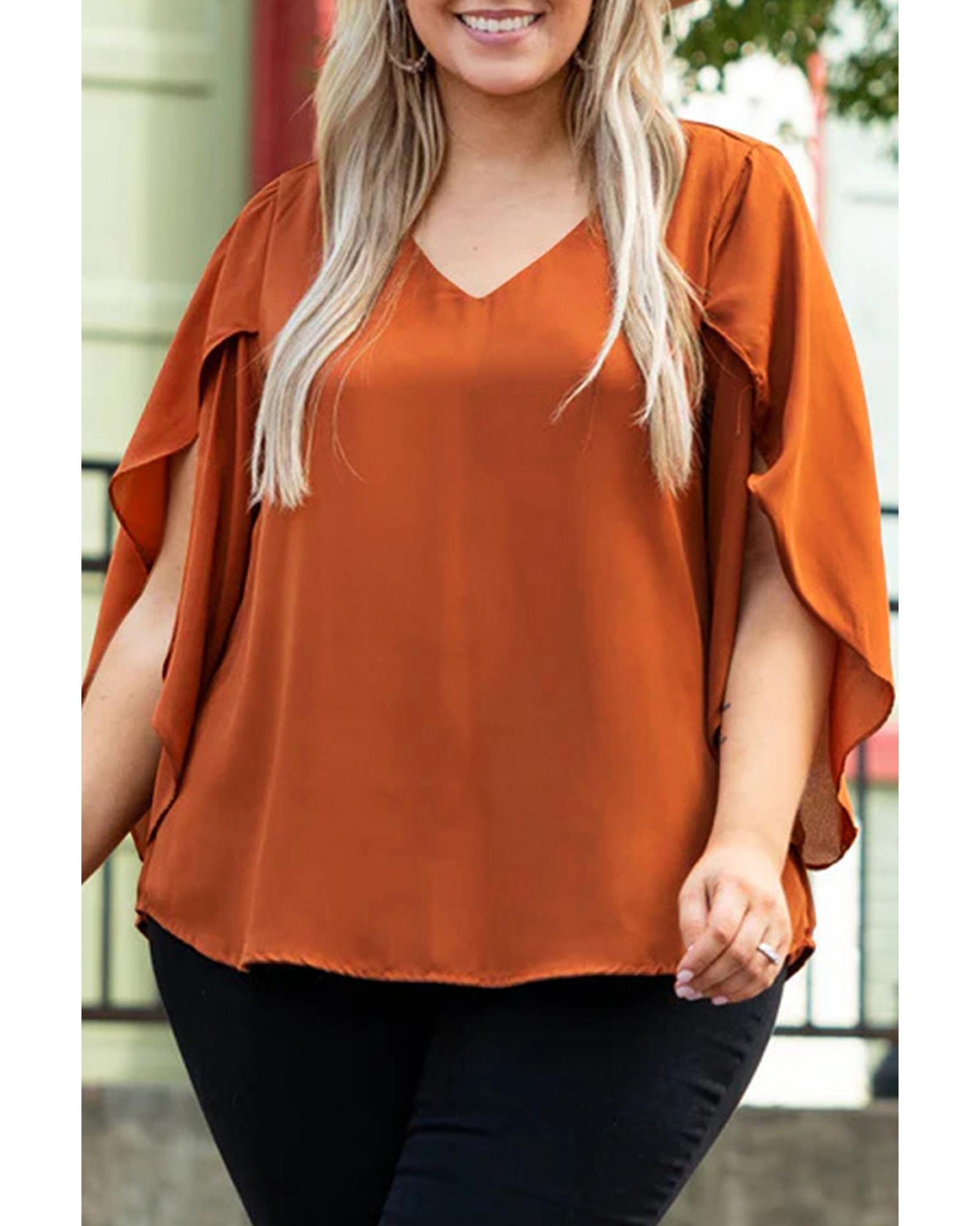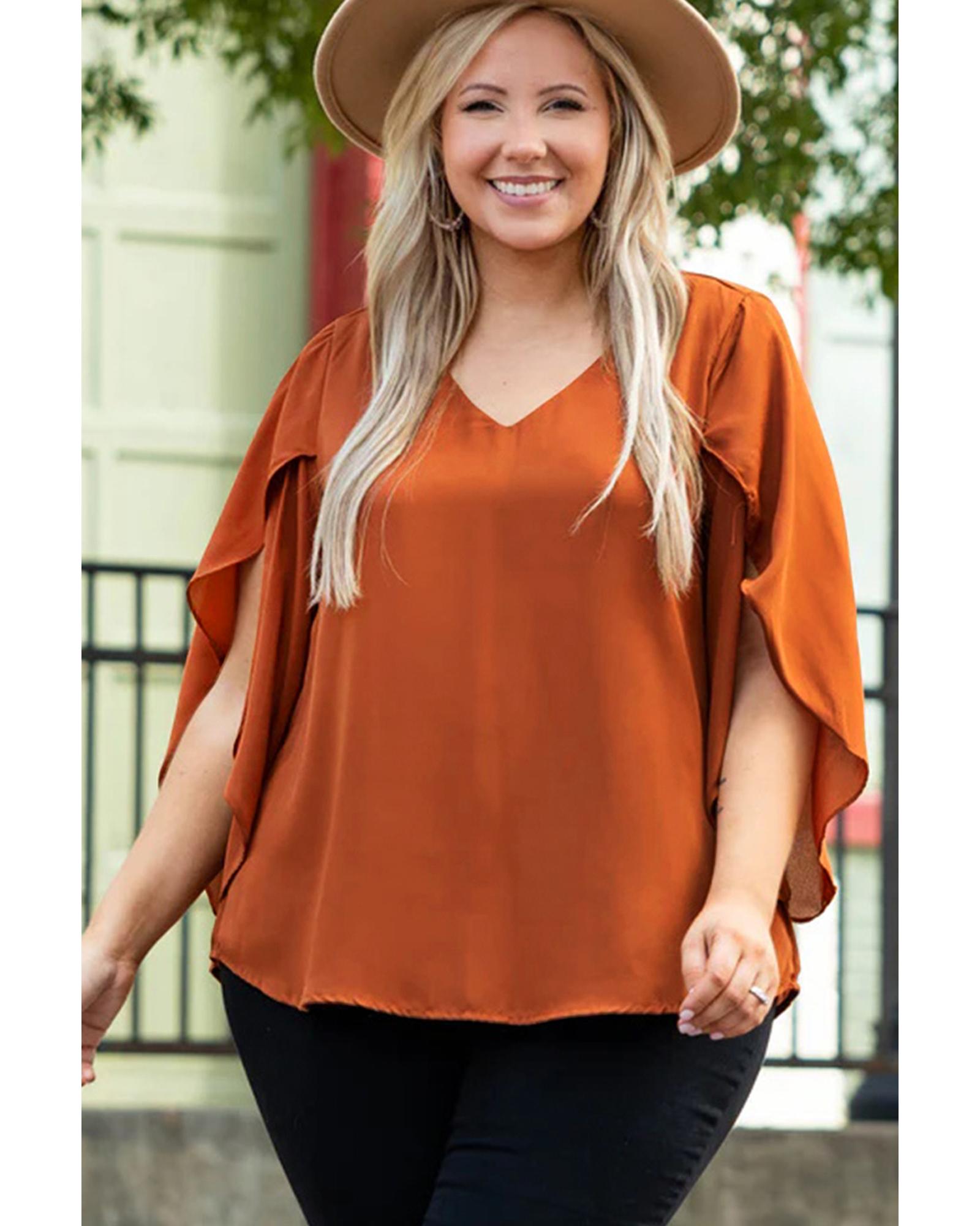 Gold Flame Plus Size Solid Wrapped Ruffled Sleeve V Neck Blouse – 1X