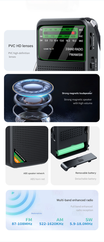 • Multi-Band Support: Covers FM (87-108MHz), AM (522-1620KHz), and SW (5.9-18.0MHz) bands.