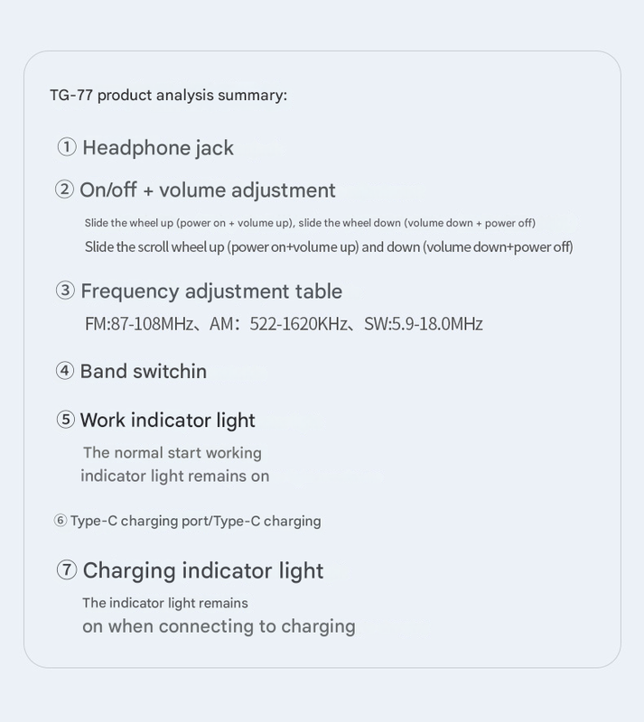 The JOC TG-77 is a versatile and user-friendly multi-band rechargeable radio designed specifically for seniors. It features automatic channel searching, high-volume output, and a long standby time, making it an ideal companion for daily use or outdoor activities. The device supports FM, AM, and SW bands, ensuring access to a wide range of channels.