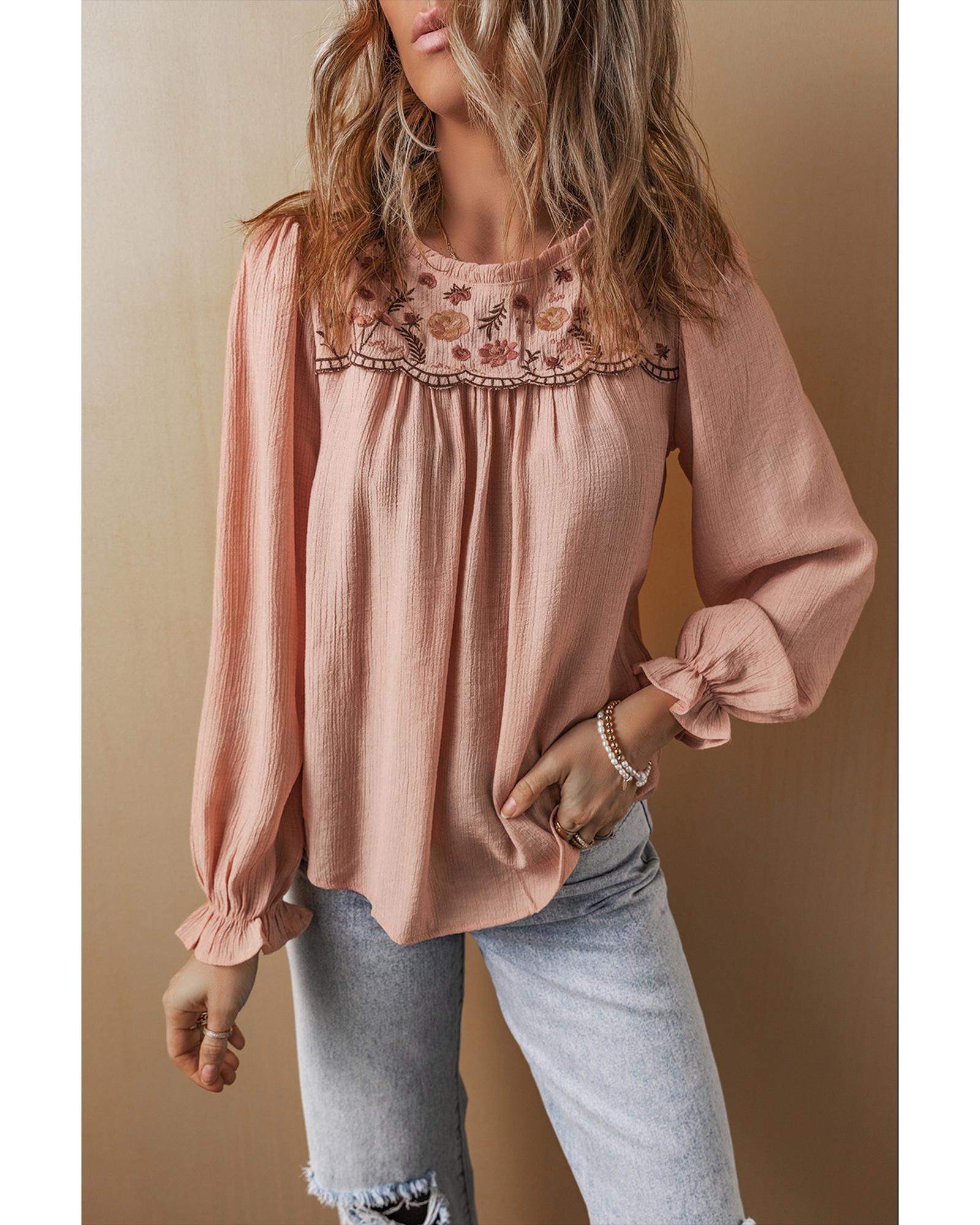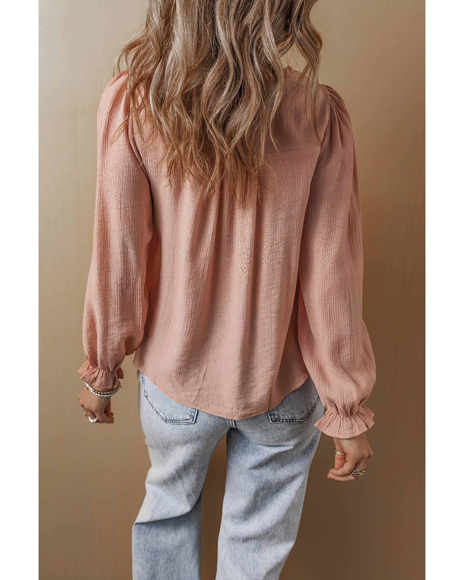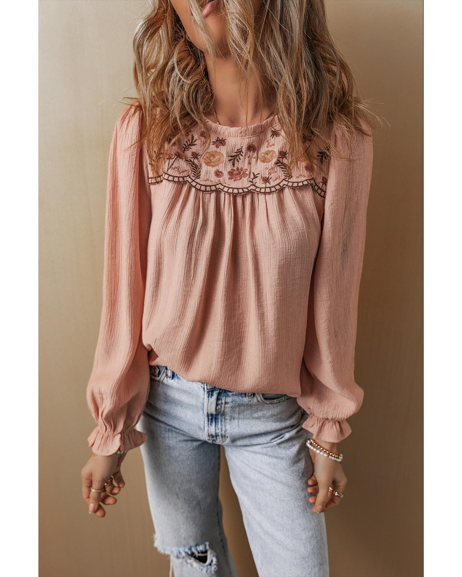 Gossamer Pink Floral Embroidered Textured Flounce Sleeve Elegant Blouse – M