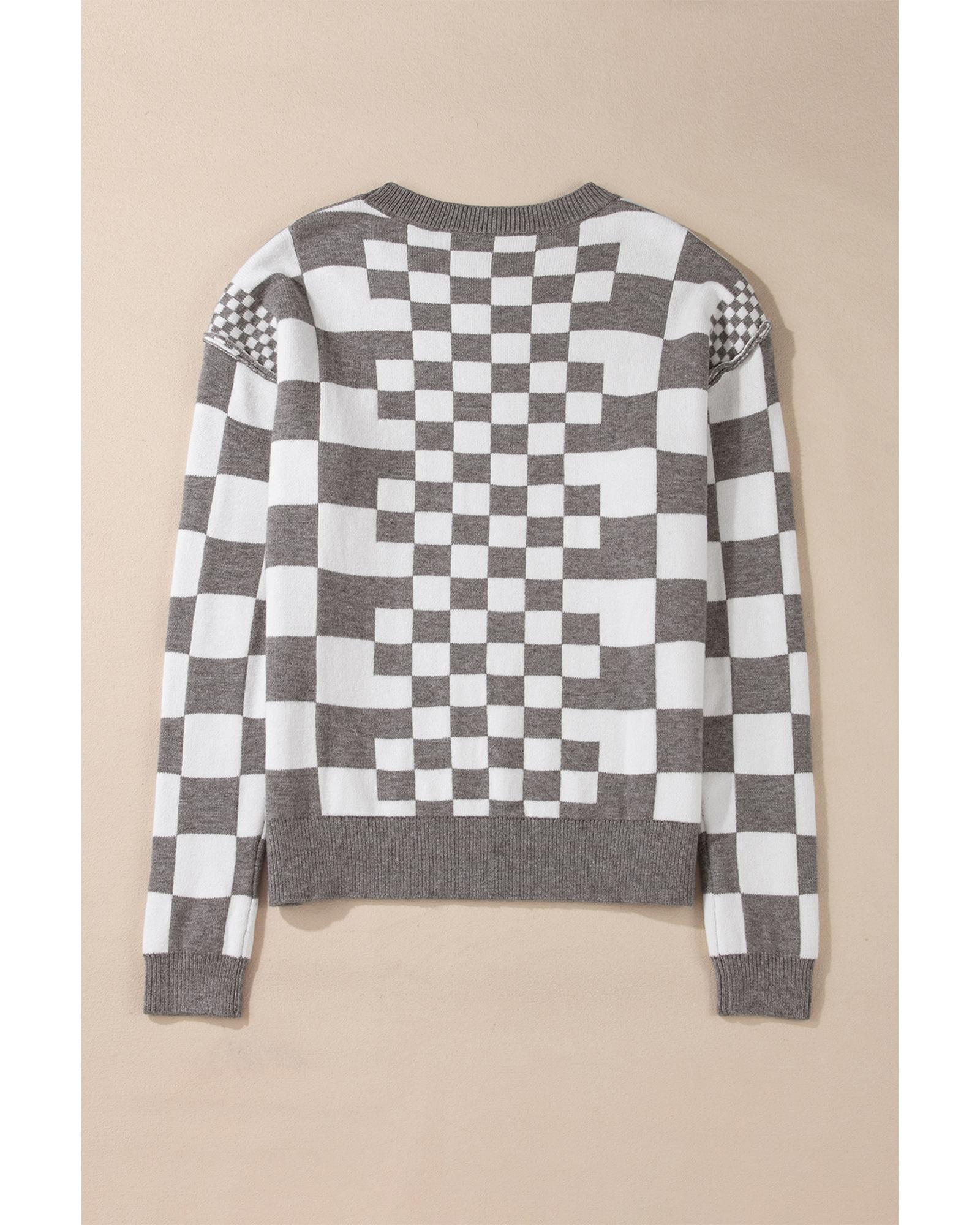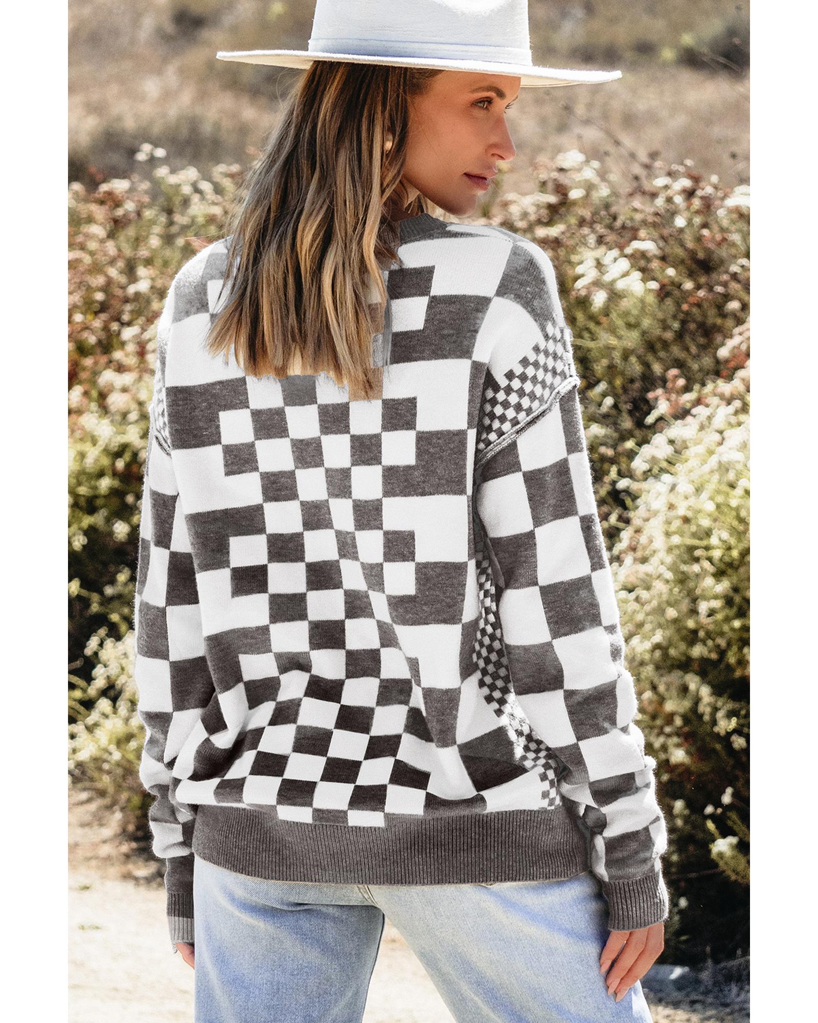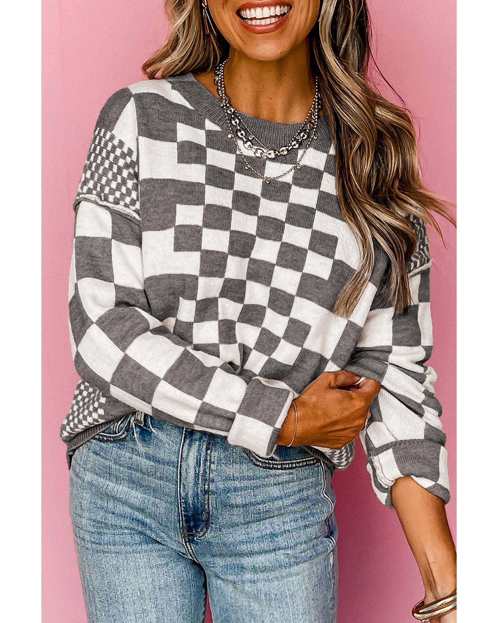 Gray Checkered Print Drop Shoulder Round Neck Sweater – L