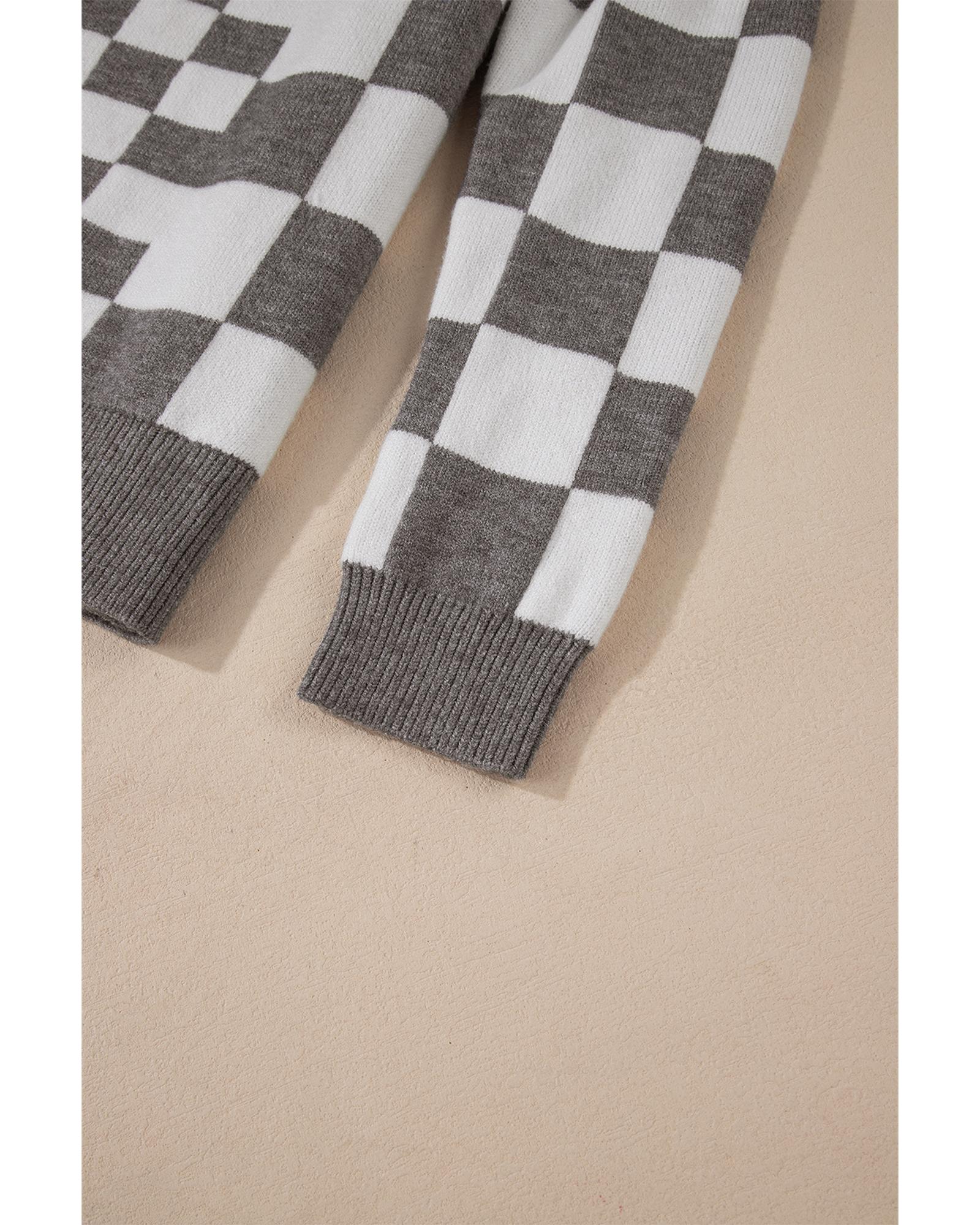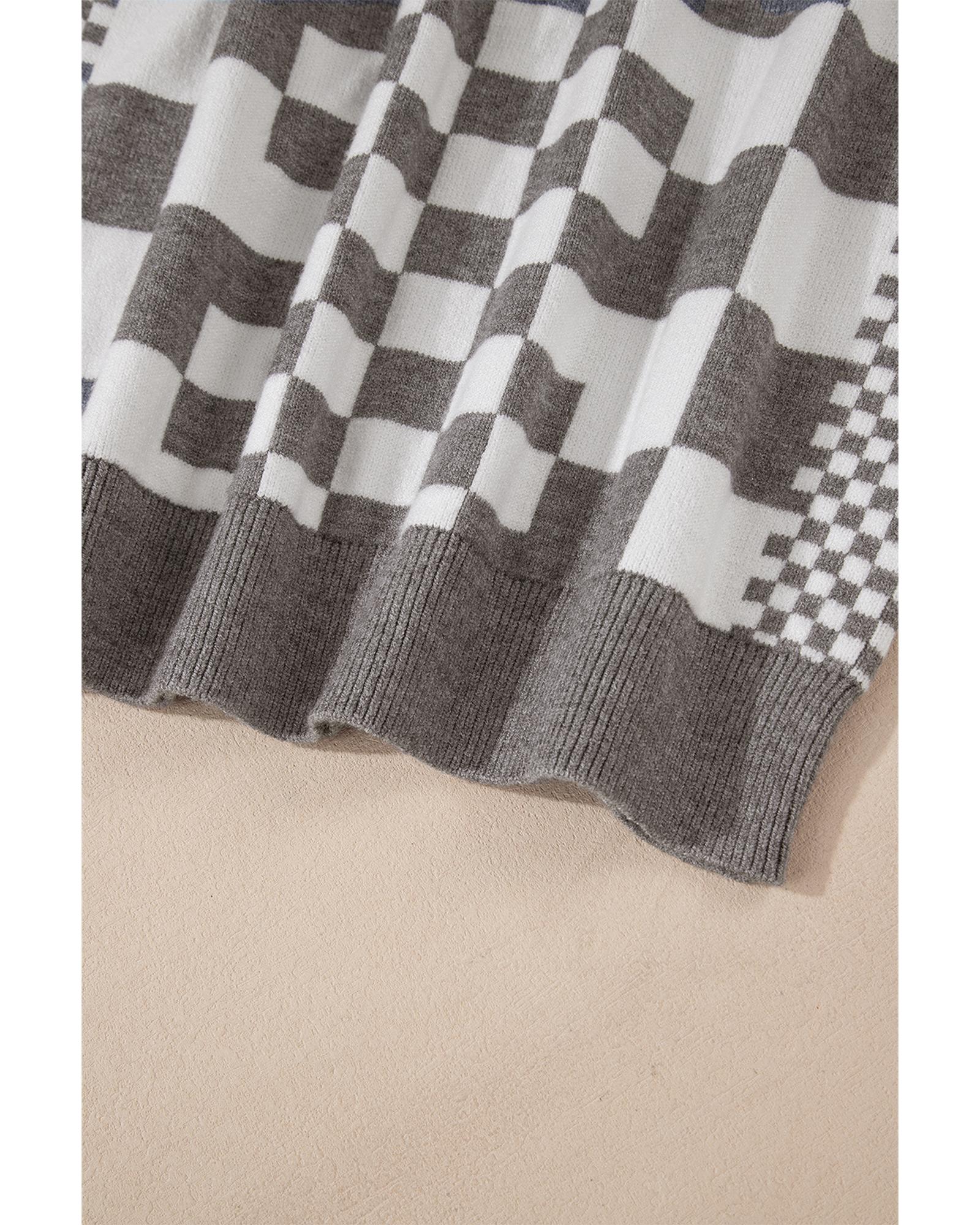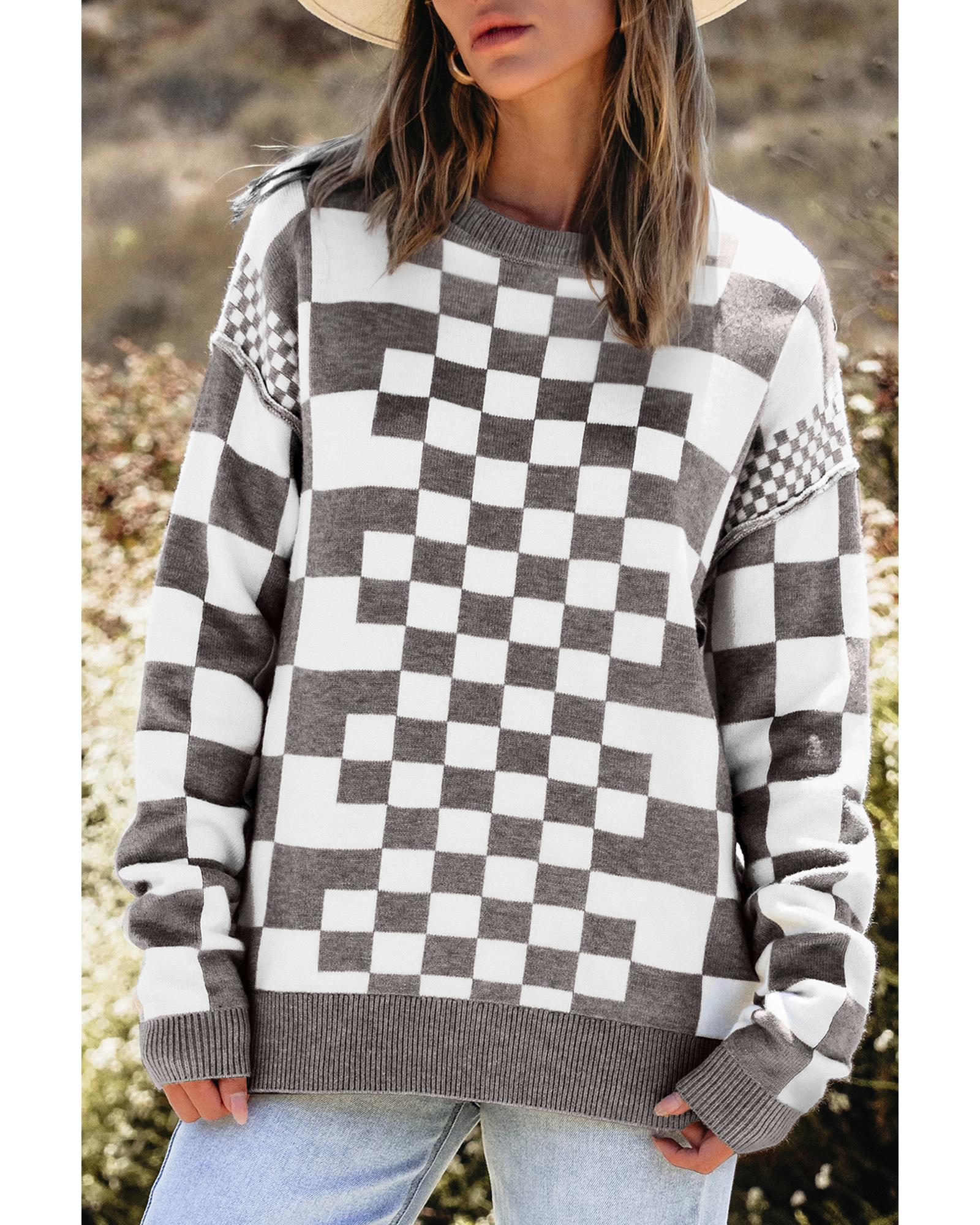 Gray Checkered Print Drop Shoulder Round Neck Sweater – L
